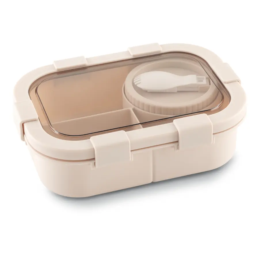 Portacomidas plástico con cuatro compartimientos, un compartimiento adicional con tapa y una cuchara / tenedor plegable.