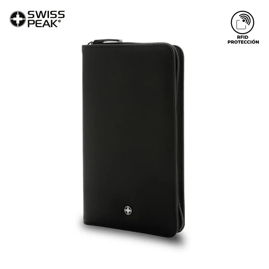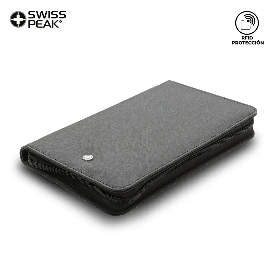 Portadocumentos en poliuretano con cierre de cremallera y 10 compartimientos internos. Su material interno permite bloquear las señales electromagnéticas RFID (Radio Frequency Identification) que se usa en tarjetas de chip, pasaportes, tarjetas electrónic