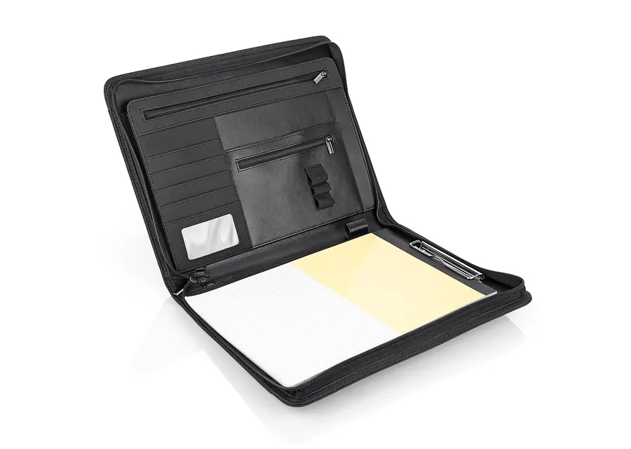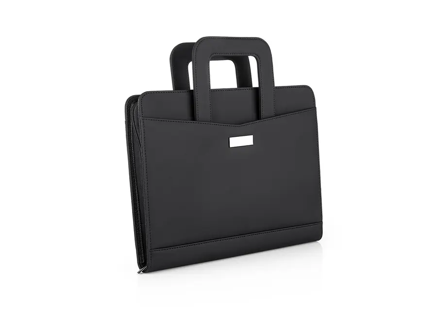 Portafolio en PU, con bloc de notas papel blanco con 30 hojas rayadas, gancho legajador metálico, dos agarrraderas que se ocultan y permiten transportar facilmente, multiples bolsillos para organizar tarjetas de presentación, bolígrafos, calculadoras, bolsillo prinicipal para guardar portatil o tablets de 12″