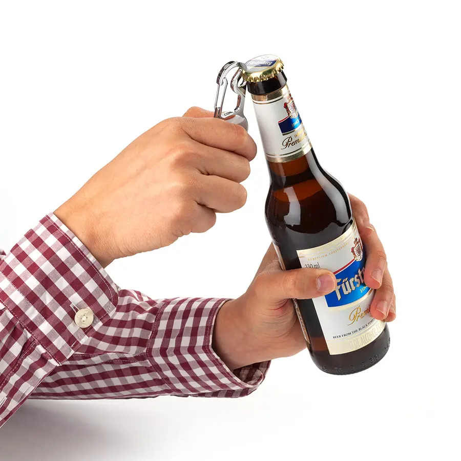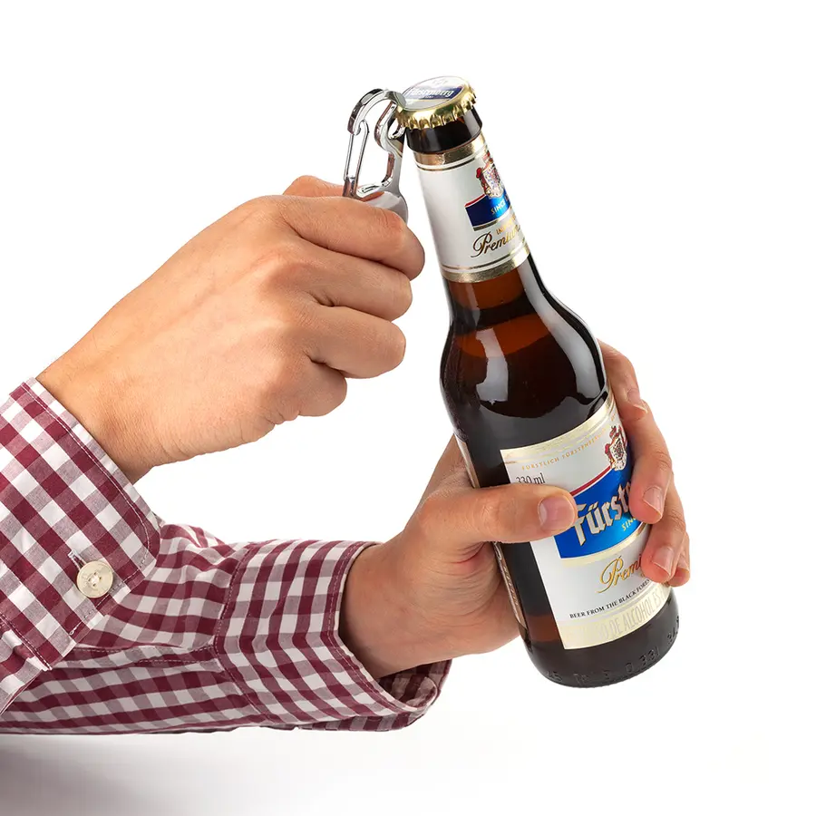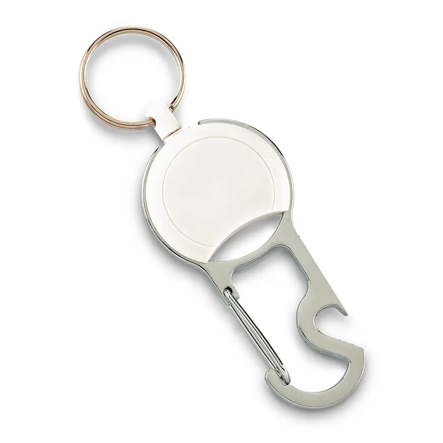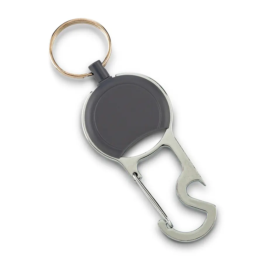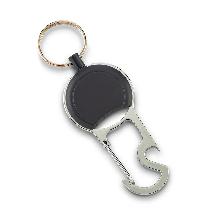 Portaidentificador con gancho carabinero en plastico y metal. Con cable retractil, destapador y argolla para llavero.