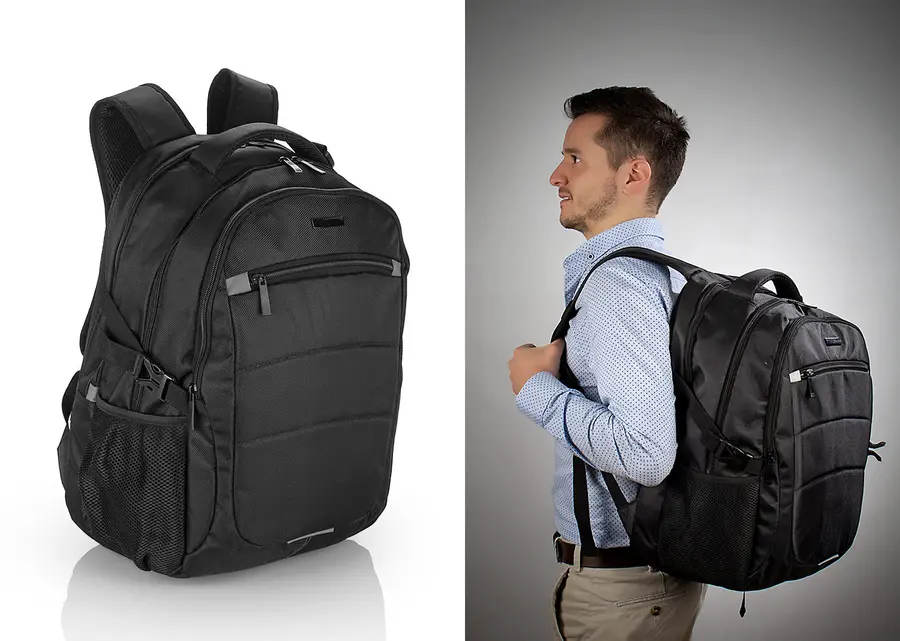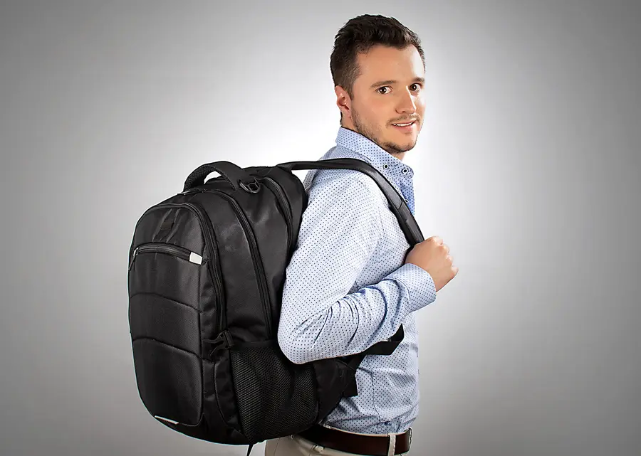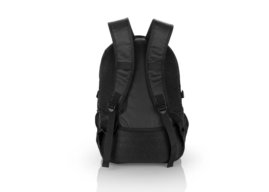 Morral Portalaptop con espaldar ergonomico, con cargaderas ajustables y acolchadas, bolsillo frontal, dos bolsillos medio con compartimentos especiales en el interior, el bolsillo principal tiene un compartimiento para dispositivos portatiles de 15″, 2 bolsillos laterales en malla. Incluye placa metálica para marca láser.