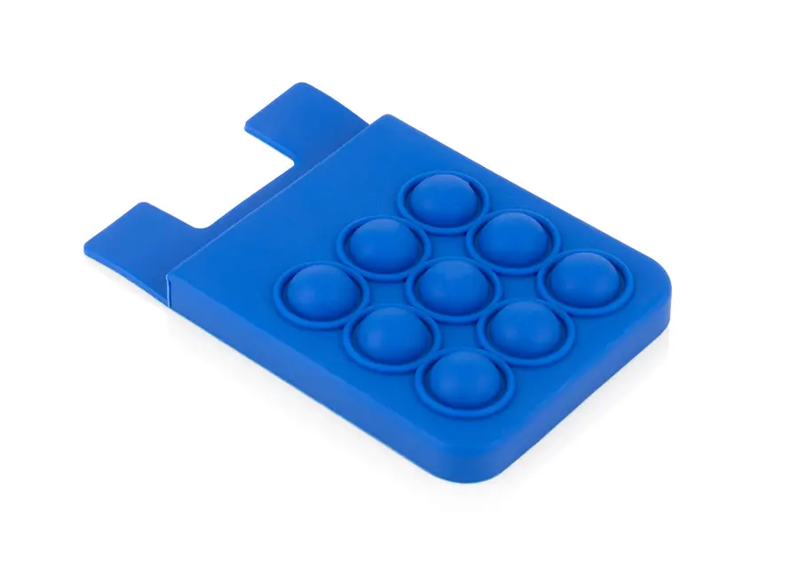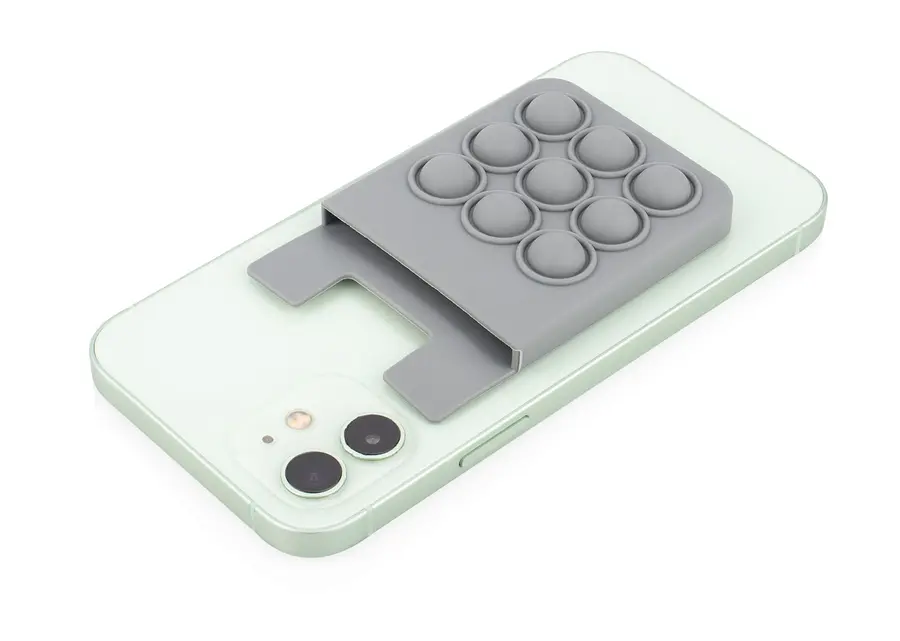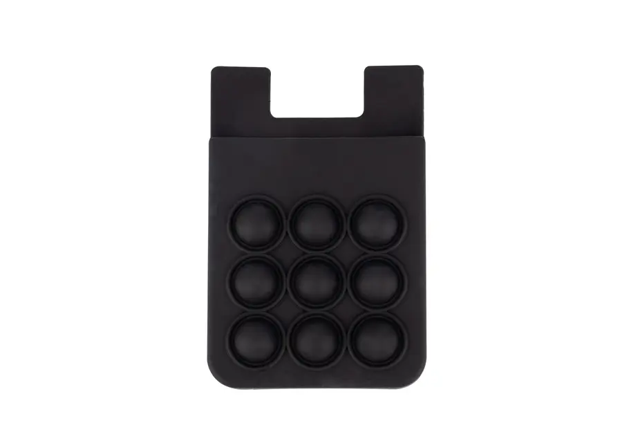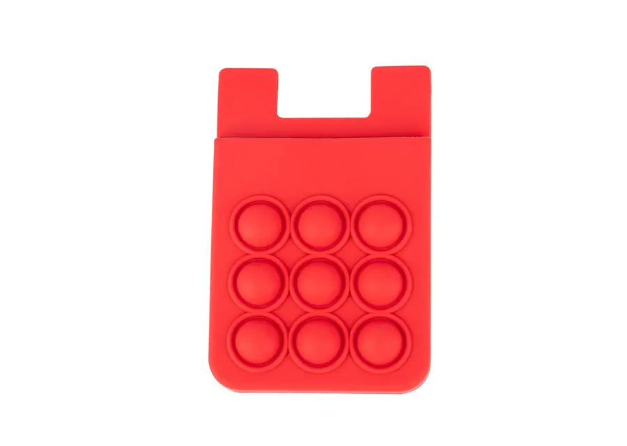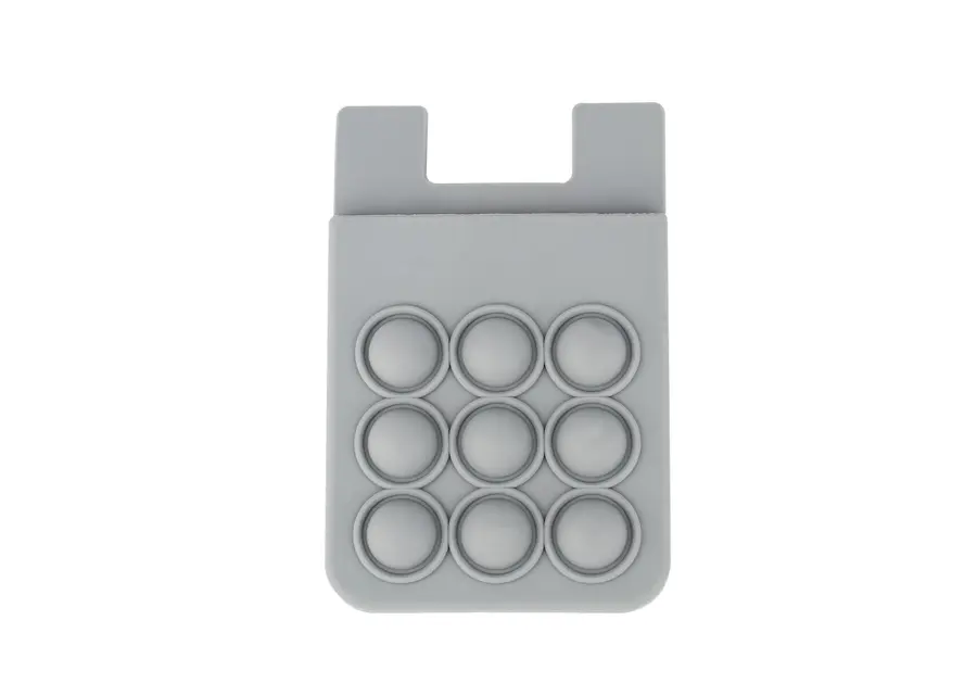 Portatarjetas de silicona diseñado para adherirse fácilmente al celular, ofreciendo una solución práctica para llevar tarjetas esenciales. Incorpora una superficie con burbujas antiestrés, ideal para relajarse en cualquier momento. Su material flexible y resistente garantiza durabilidad y comodidad en el uso diario.
