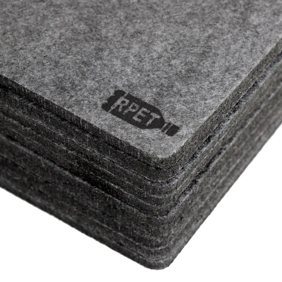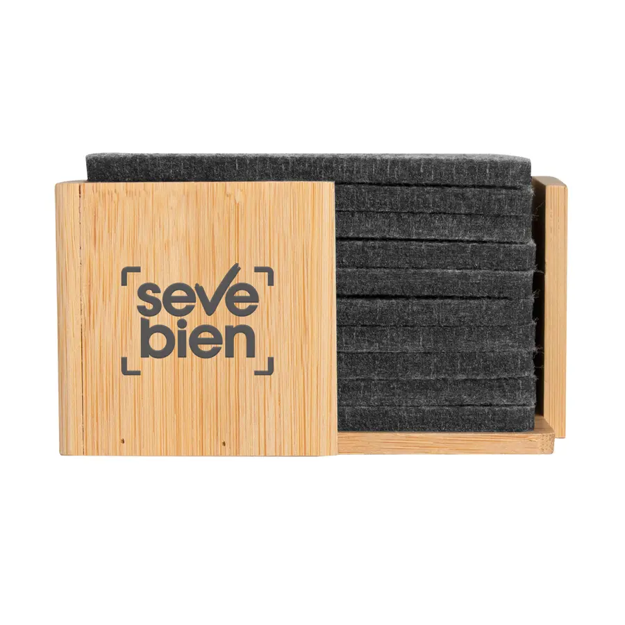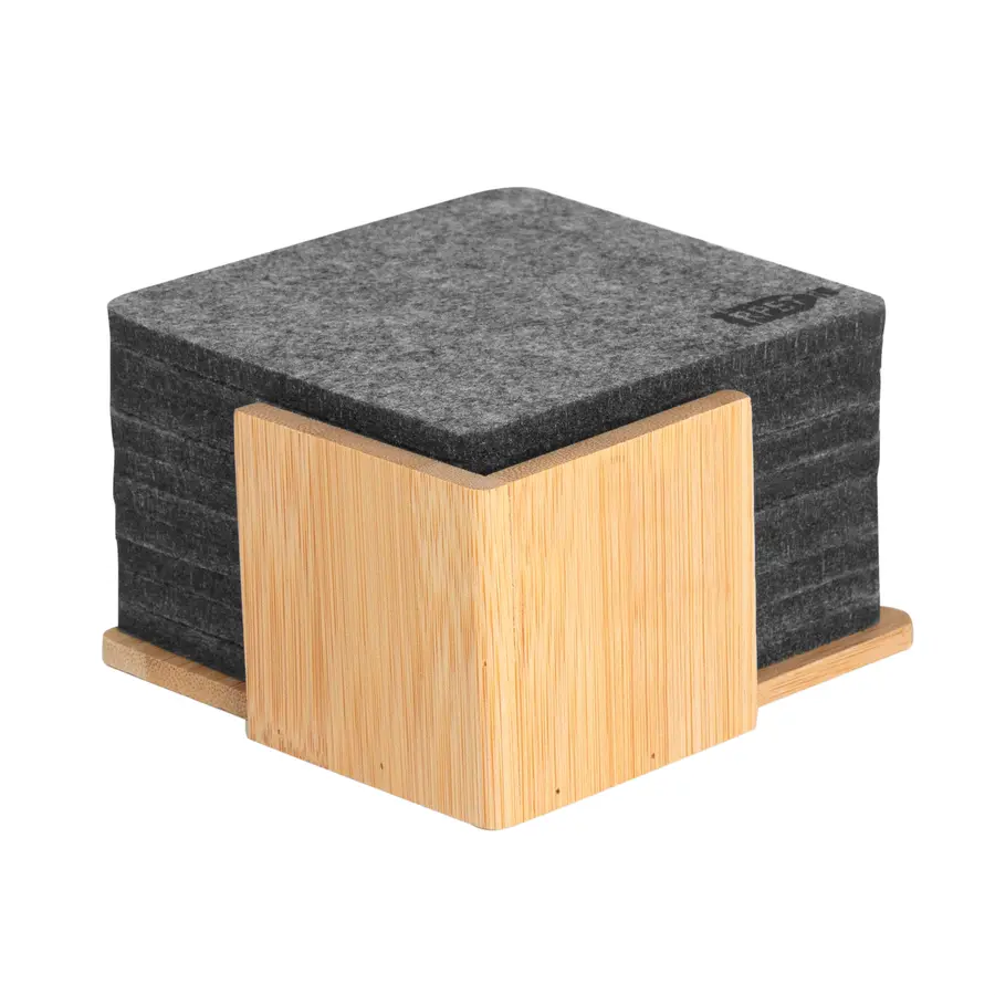 Fieltro de plástico reciclado y Bambú. Set de 10 posavasos. El primero lleva impreso el sello RPET. Soporte de bambú de 10,5 x 10,5 x 5,5 cm Presentación en caja de regalo kraft.