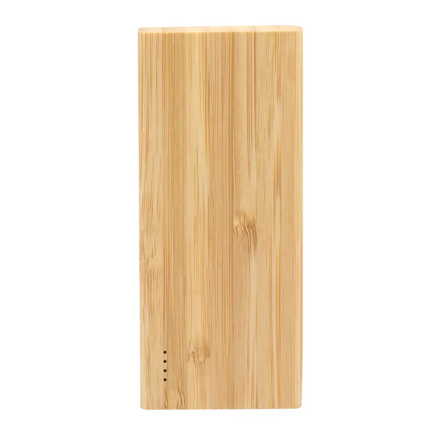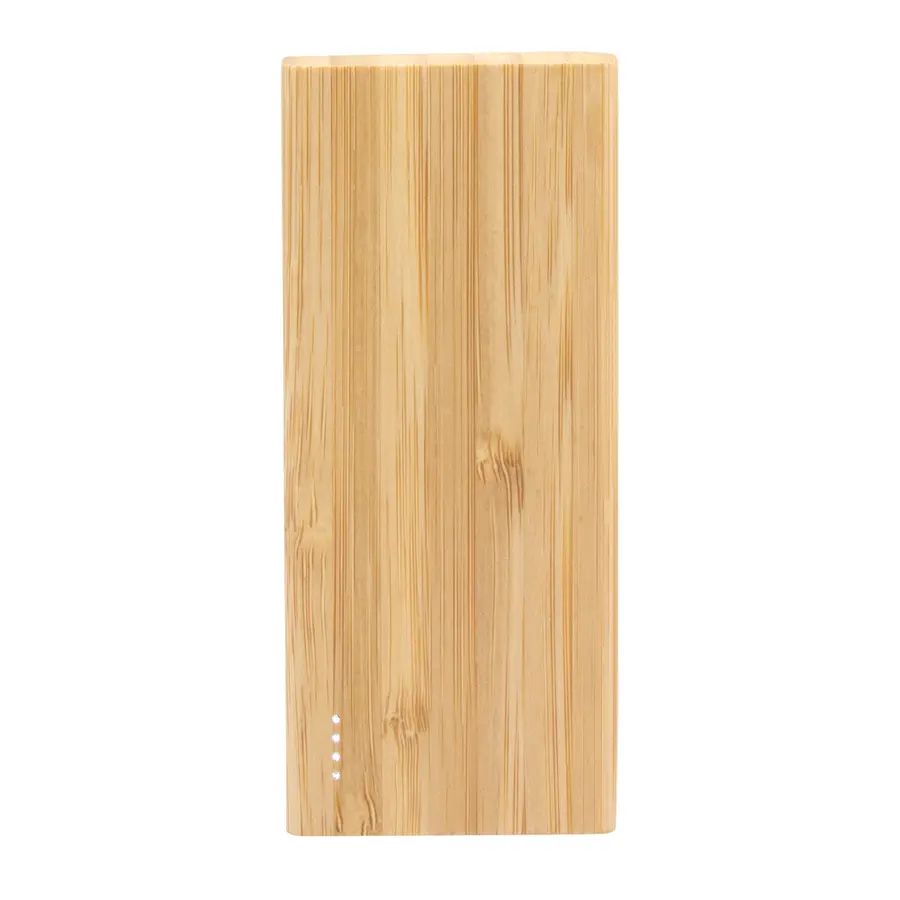 12 x 5,2 x 1,4 cm. Capacidad 5000 mAh. Bambú. Power bank. Batería portátil con 1 puerto de entrada micro + 1 tipo C y 1 puerto de salida USB. Entrada y salida: 5V/2A. Indicador de potencia de 4 leds. Cable de carga USB tipo C de 30cm de largo en color blanco. Tiene múltiples protecciones: de carga y descarga, de sobrecarga y protección de corto circuito. Presentación en caja de regalo kraft.