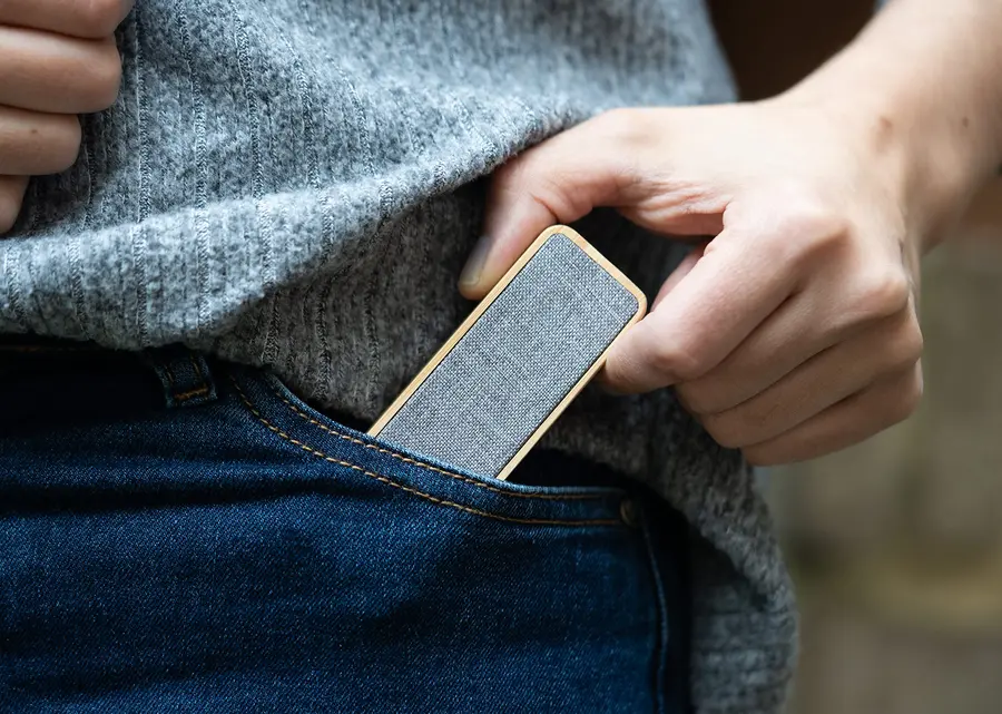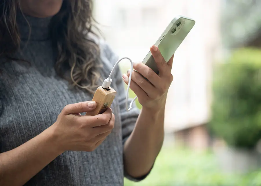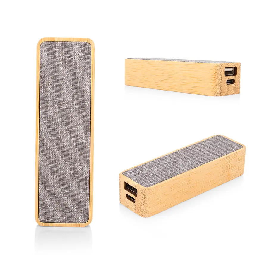 Asequible y sostenible: Bambú + RPET – Compacto. Fácil de transportar. Diseñado para carga en exteriores y emergencias. Entrada tipo C, salida USB, batería de litio 4000 mAh.