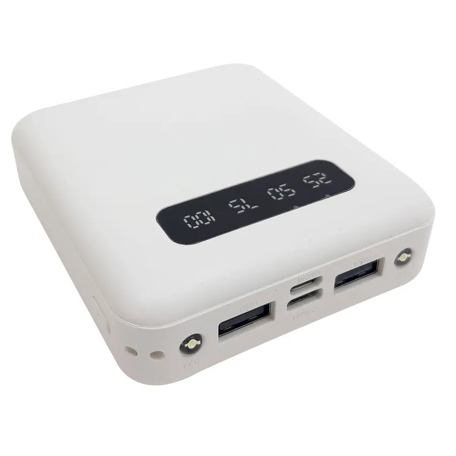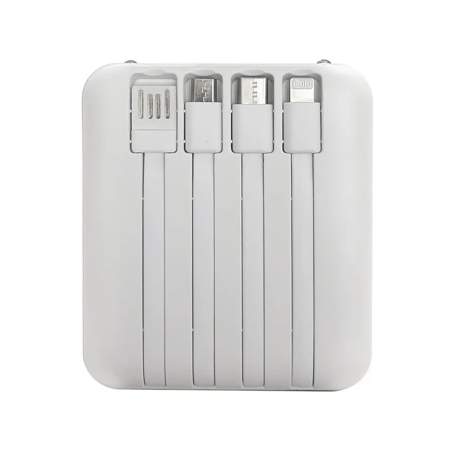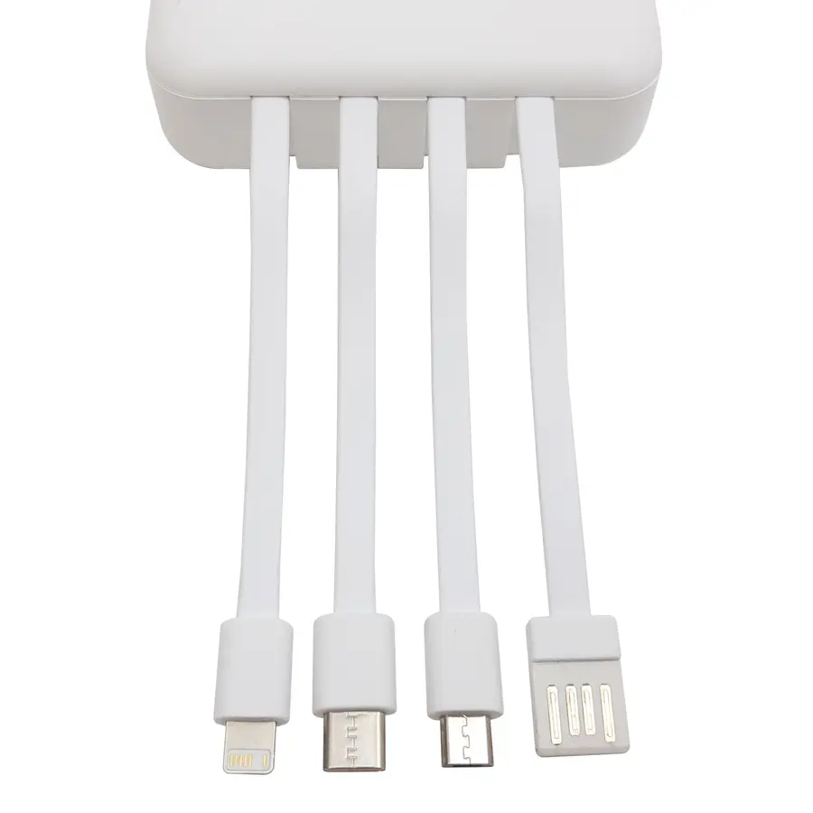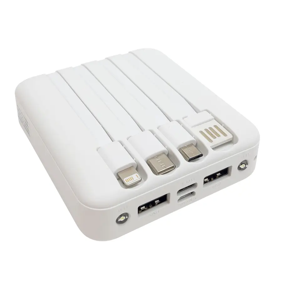 8,8 x 7,9 x 2,6 cm. Plástico ABS acabado mate. Powerbank multipuerto. Pantalla digital. Doble salida USB. Entradas micro-USB y USB tipo C. Salida de carga rápida 2A. Linterna dual led. 4 cables de carga integrados: USB, Micro USB, Tipo C y IPhone. Capacidad: 5000 mAh. Puede cargar hasta 5 dispositivos al tiempo. Presentación en caja de regalo.