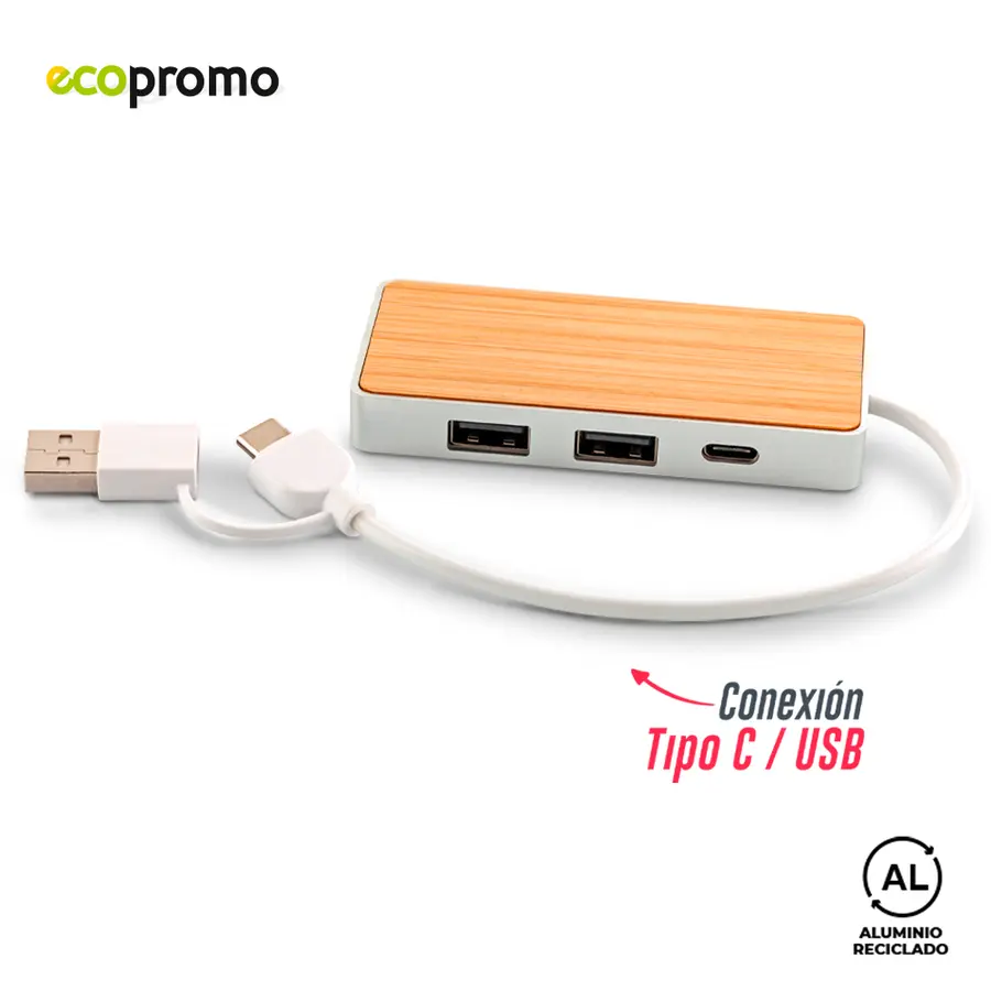 Puerto USB en bambú y acero reciclado con doble conexión Tipo C y USB. Dos puertos USB y uno Tipo C. Empaque caja individual.
