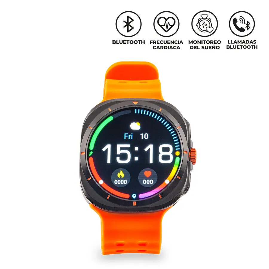 Incluye correa naranja y negra.