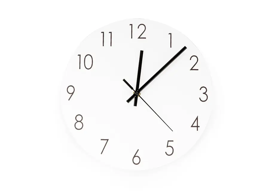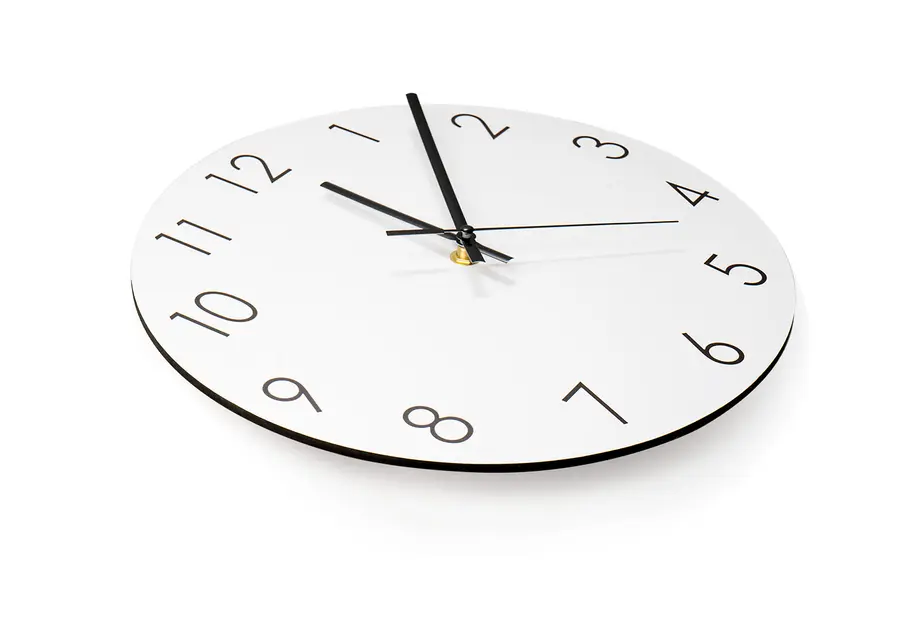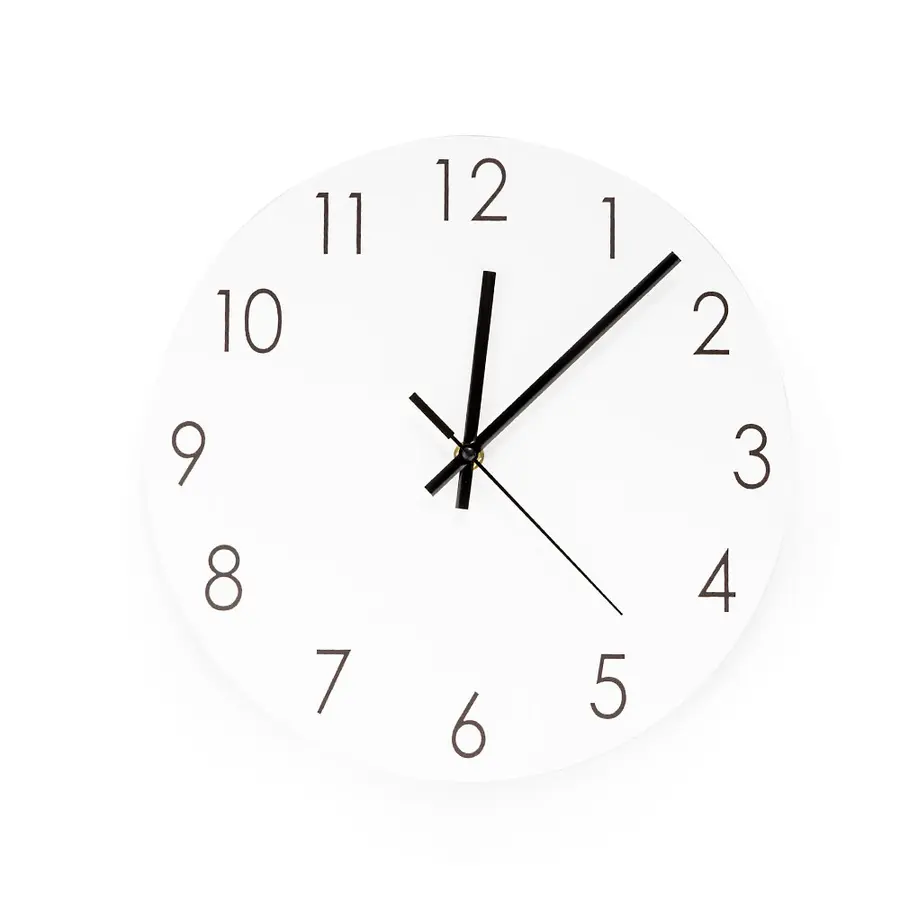 Reloj de pared en MDF (madera) con manecillas de aluminio. No incluye baterías.
