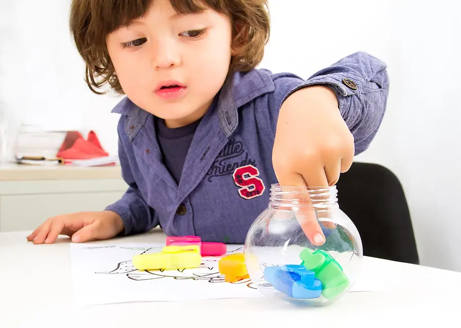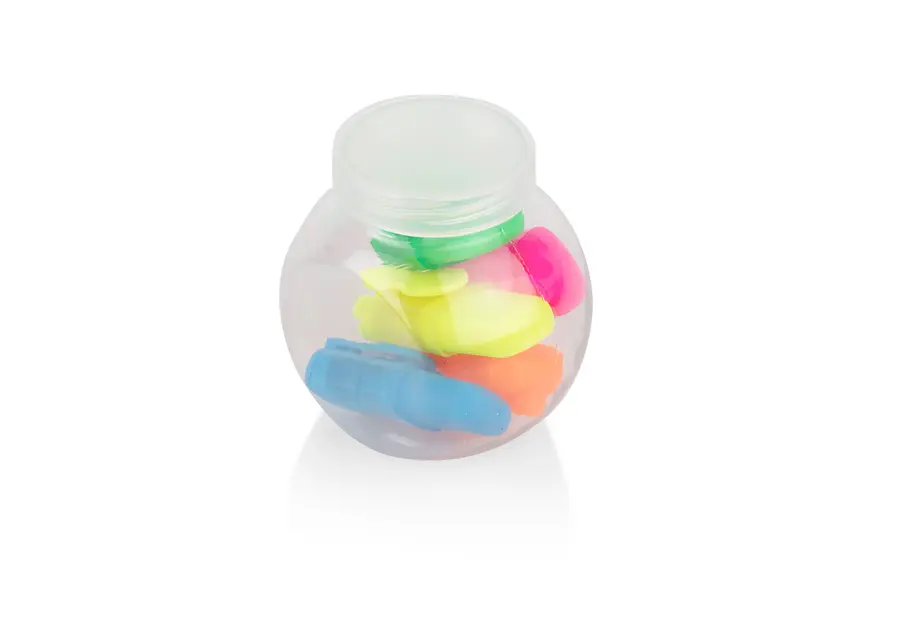 Juego de 5 resaltadores en estuche traslucido plástico. Colores rosado, naranja, azul, verde y amarillo.