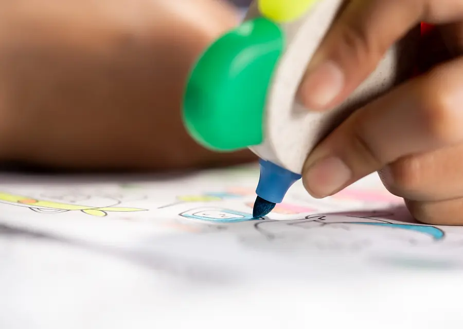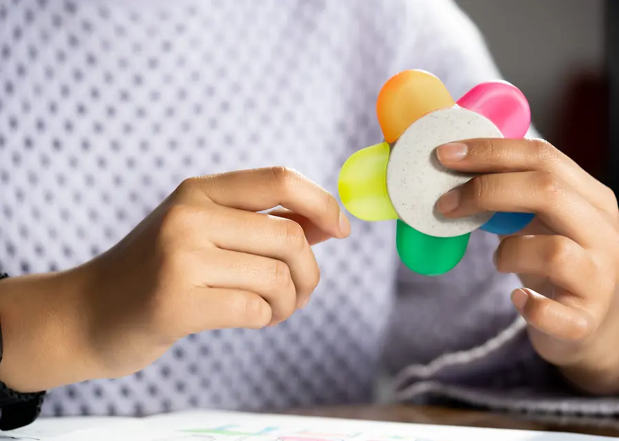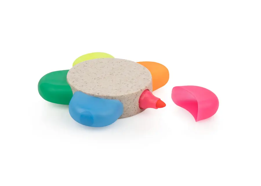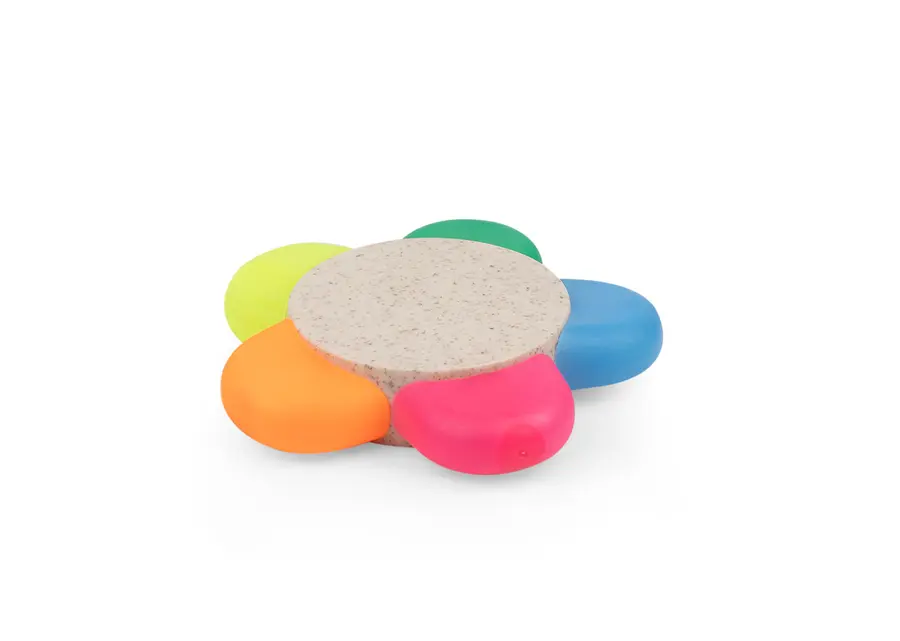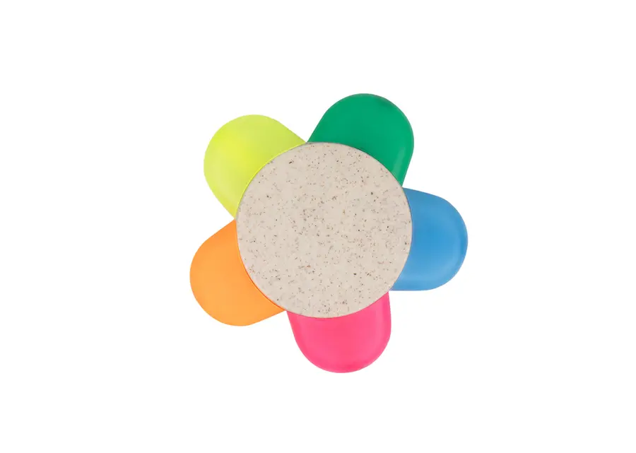 Resaltador con forma de flor, con 5 colores de tinta: azul, rosado, naranja, amarillo y verde. Elaborado con paja de trigo.