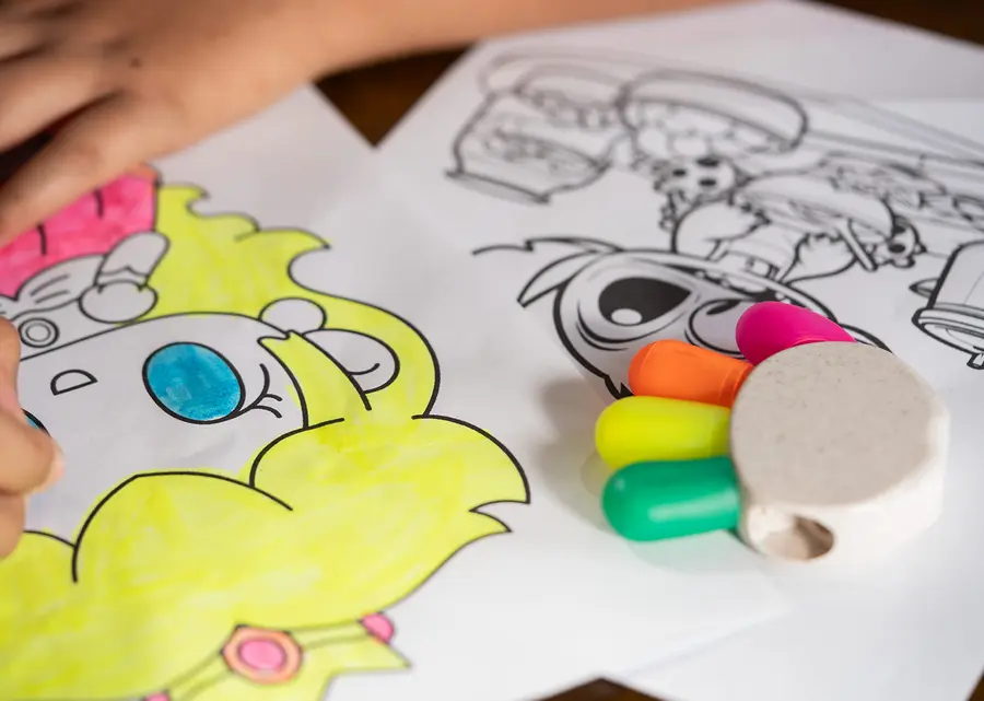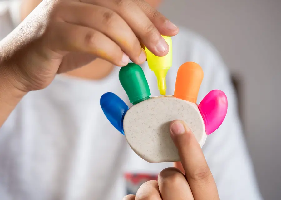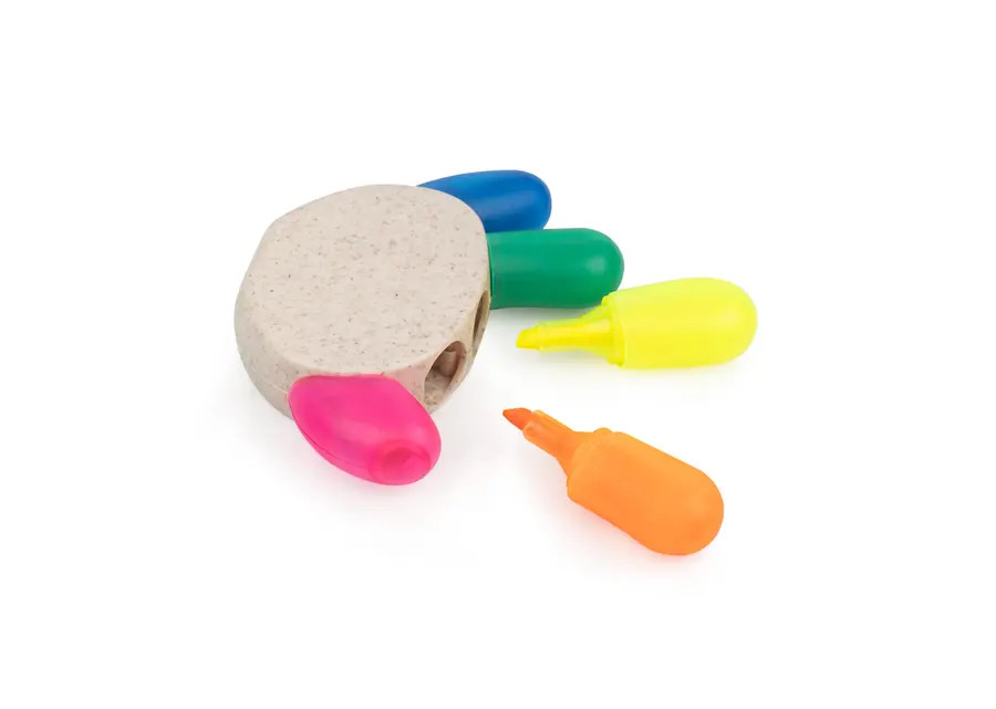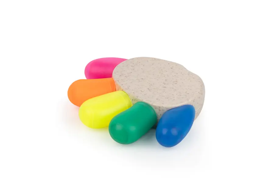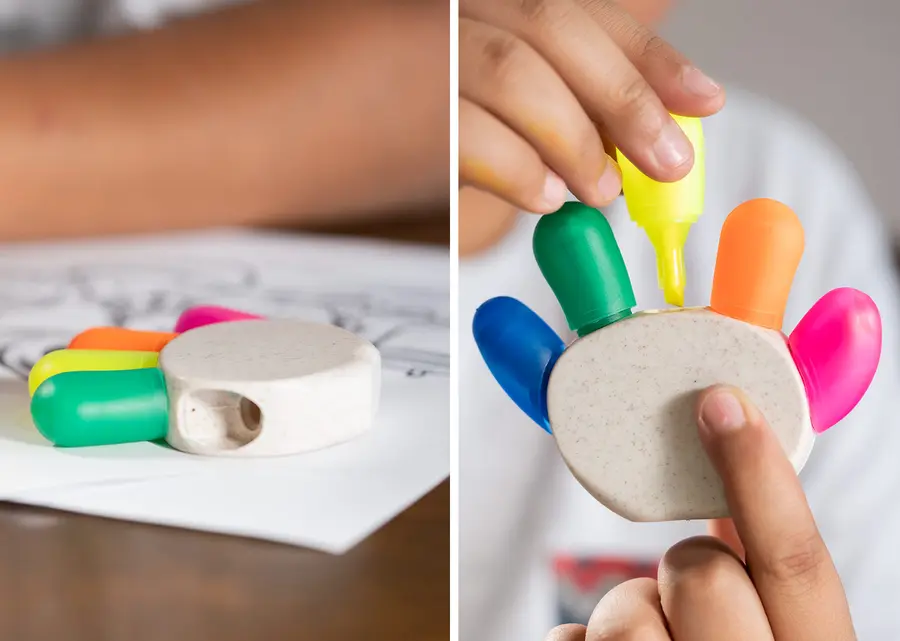 Resaltador con forma de palma de mano, con 5 colores de tinta: azul, verde, amarillo, naranja y rosado. Elaborado con paja de trigo.
