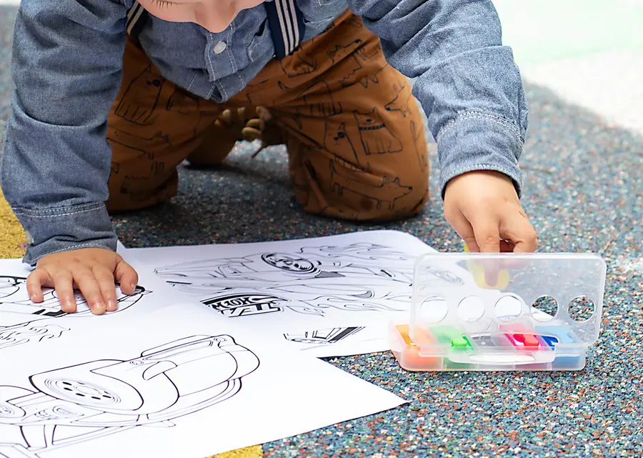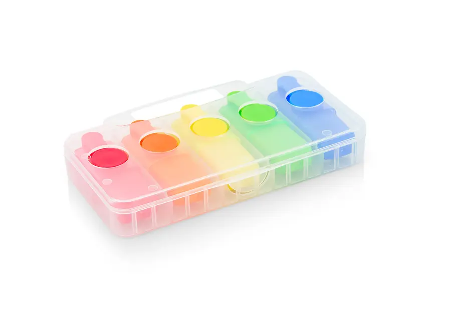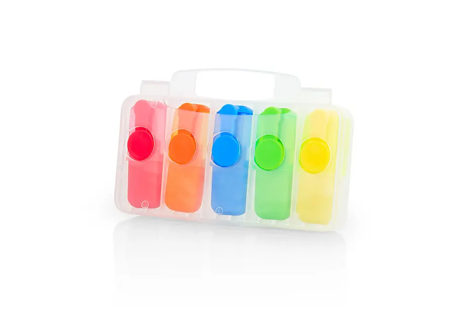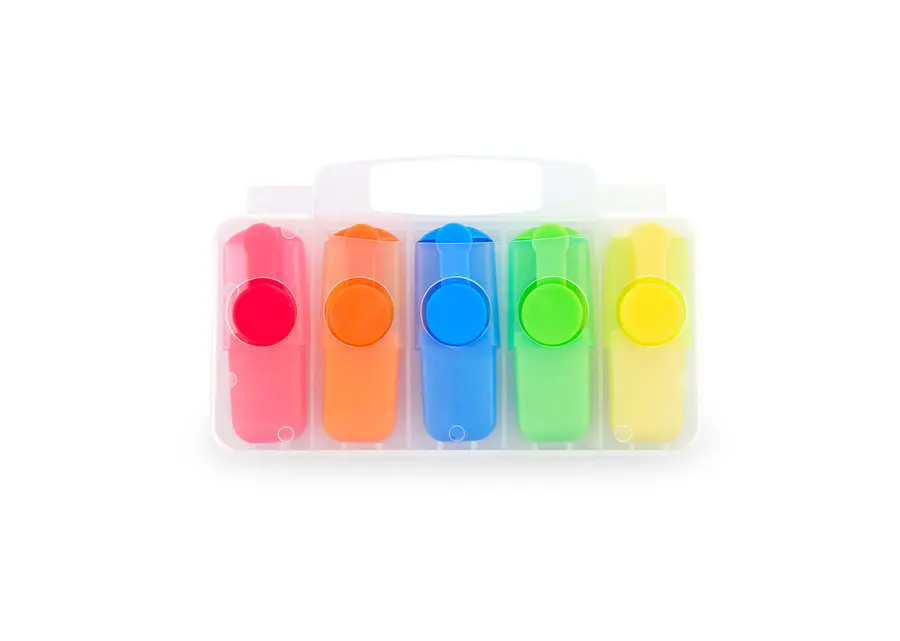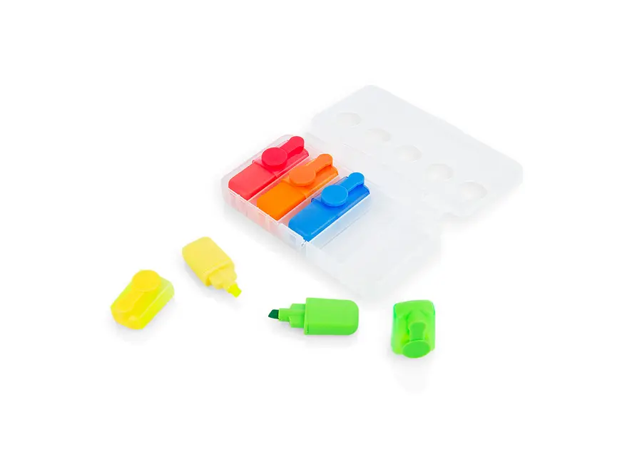 Set de 5 resaltadores en estuche traslúcido plástico.