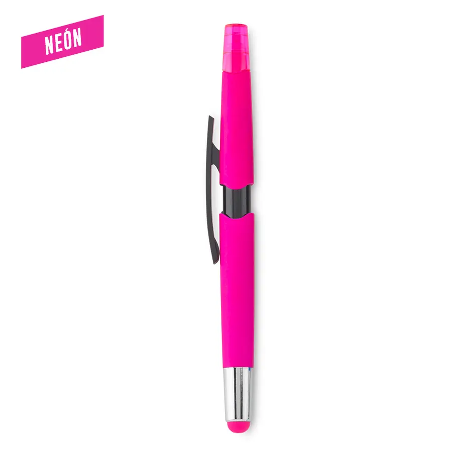 Bolígrafo plástico. Stylus en la punta y mecanismo push. Resaltador de tinta.