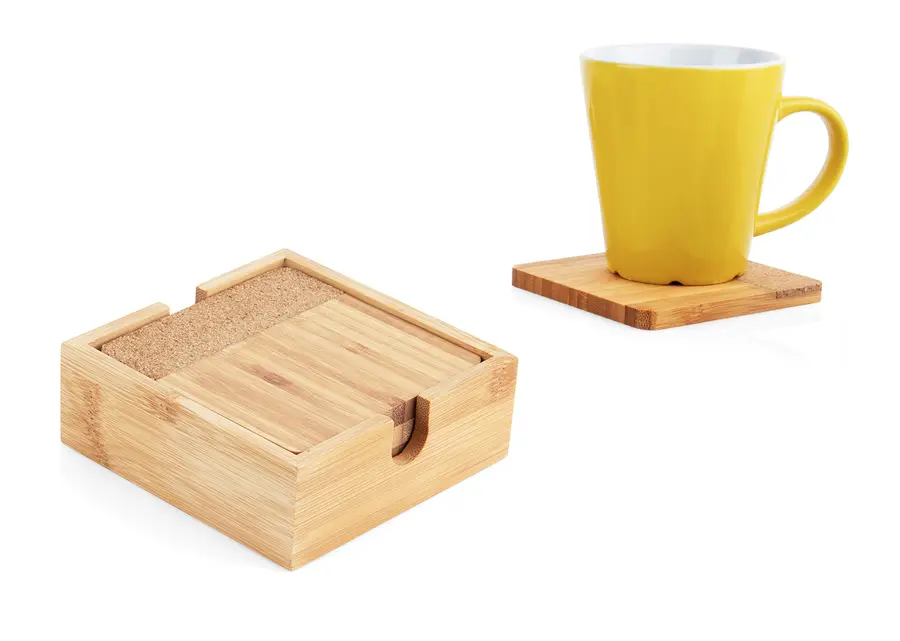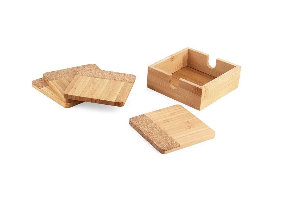 Set de Portavasos en Bambú y corcho x 4 uds con estuche en Bambú. Lavar con agua y jabón y dejar secar al aire libre.