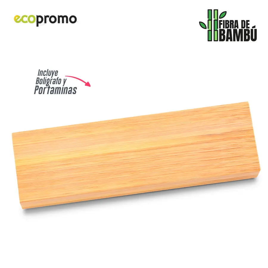 Set Bolígrafo y Portaminas (mina 0.5mm). Barril en bambú y partes plásticas en ABS con fibra de bambú. En estuche de papel forrado. Mecanismo Push. Clip metálico.
