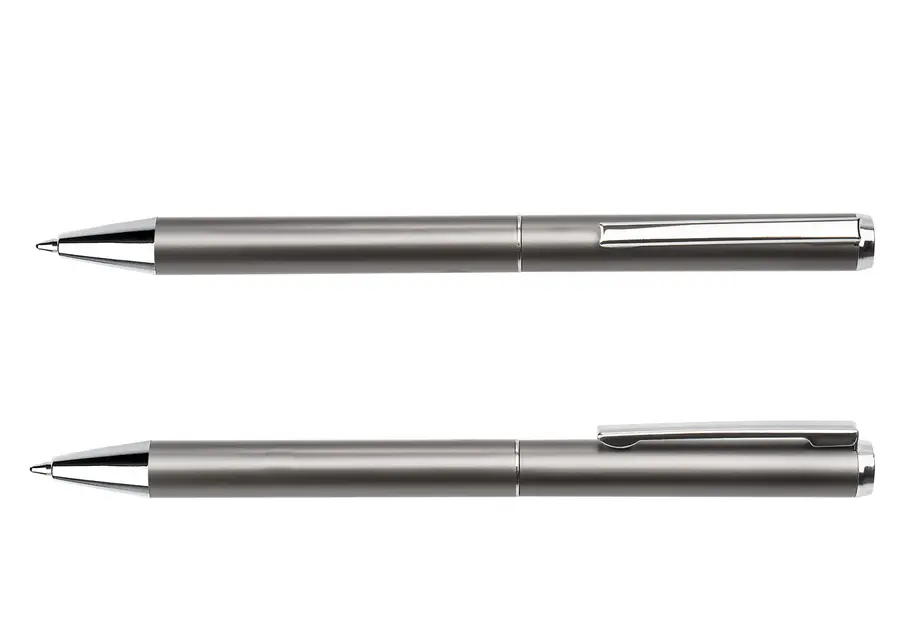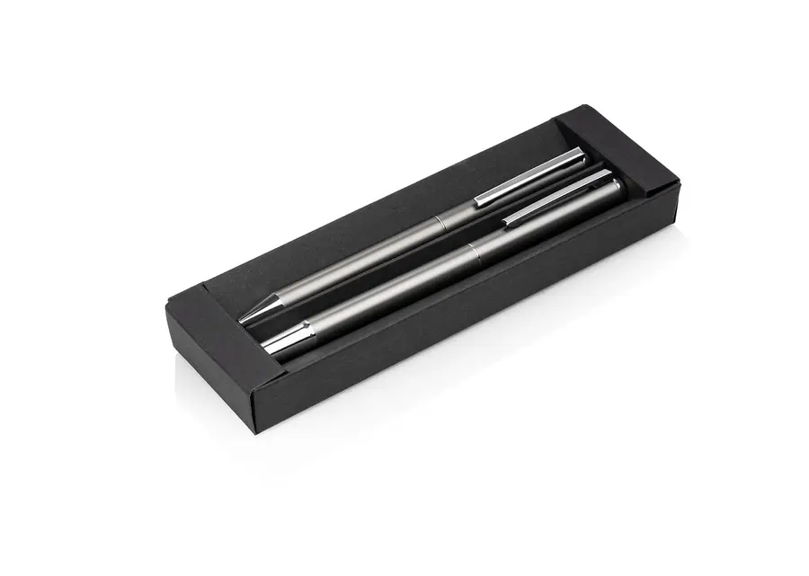 Set de bolígrafos hechos con aluminio reciclado. Cada bolígrafo es retráctil de mina normal más bolígrafo roller, con tapa a presión. Incluyen estuche de lujo.