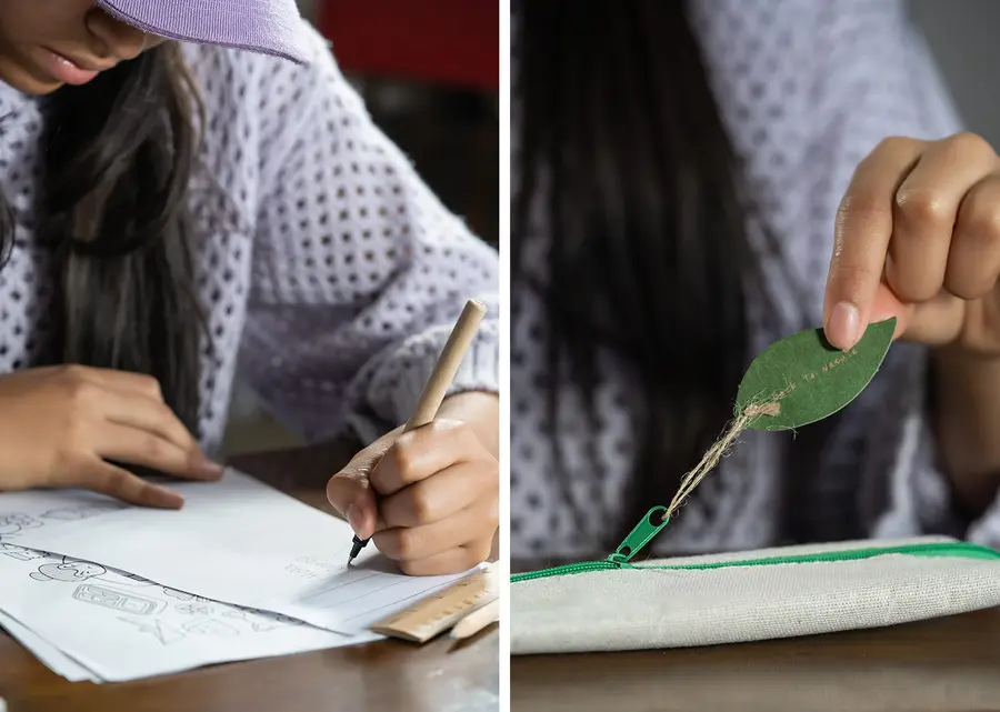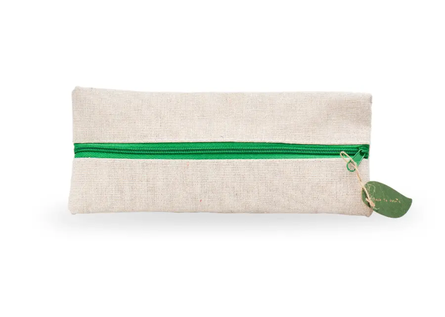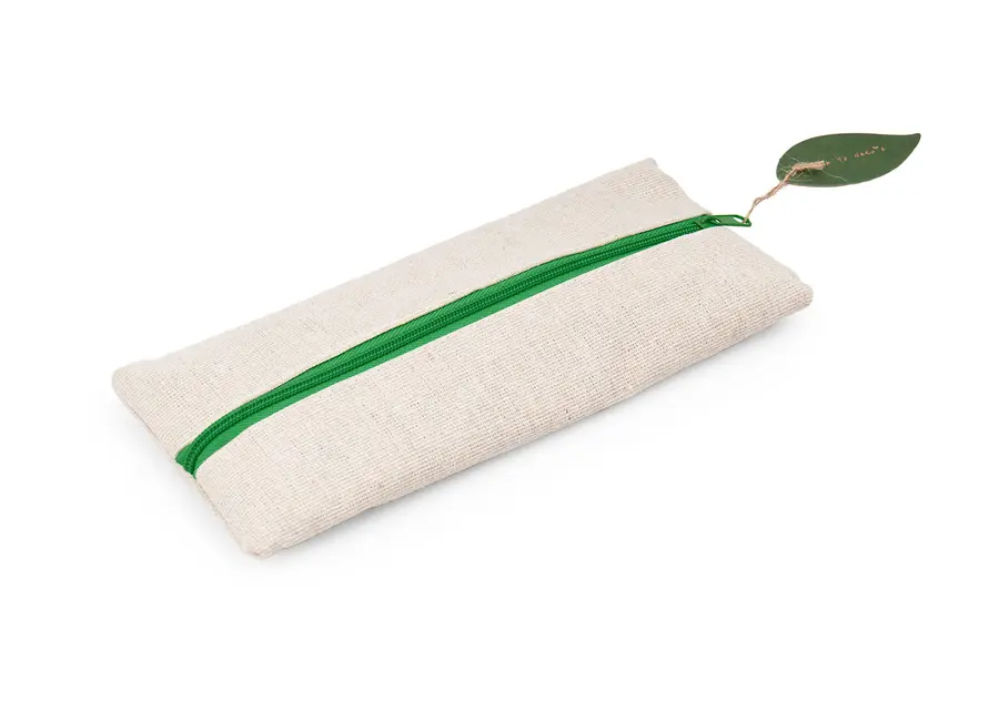 Cartuchera escolar de diseño fresco y natural que incluye: lápiz, bolígrafo, borrador, sacapuntas y regla de 15 cm.