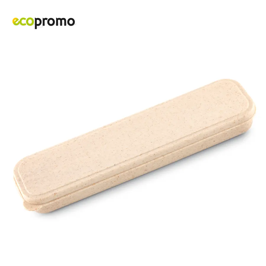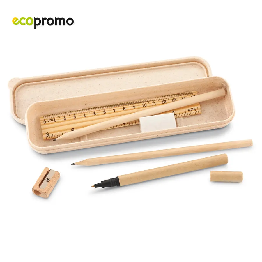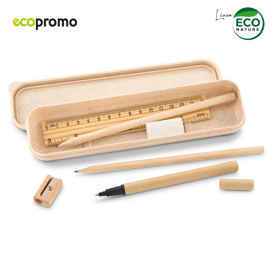 Set escolar ecológico. Incluye 2 lapices en madera, 1 regla en madera, 1 bolígrafo en cartón, 1 tajalápiz en madera y 1 borrador. Estuche en fibra de trigo.