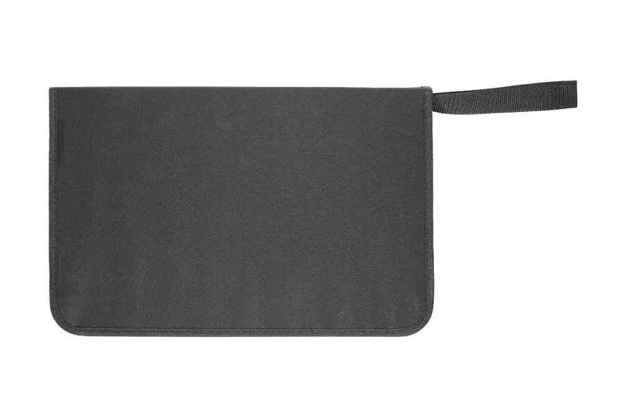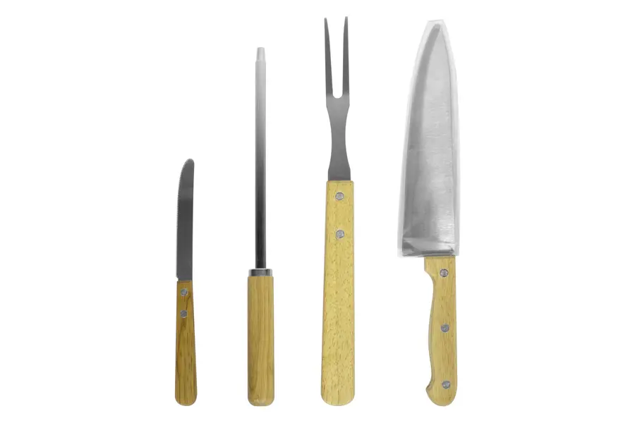 23 x 35,5 x 4,2 cm. Poliéster 300D, bambú y acero inoxidable. Set de asado de 5 piezas: Tabla de bambú 32,5 x 21,5 x 1,1 cm. Tenedor asador, cuchilla, cuchillo y chaira para afilar, todos con mango de madera barnizados. Presentación en caja de regalo.