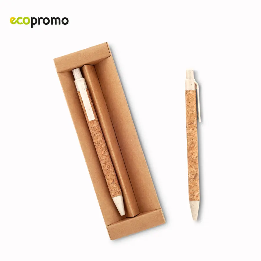 Set Bolígrafo y Portaminas (mina 0.5mm). Barril en corcho y partes plásticas en ABS con fibra de trigo. En estuche de cartón. Mecanismo Push. El porcentaje de material ecológico tiene un promedio de biodegradabilidad de 2-3 años después del fin de su vida