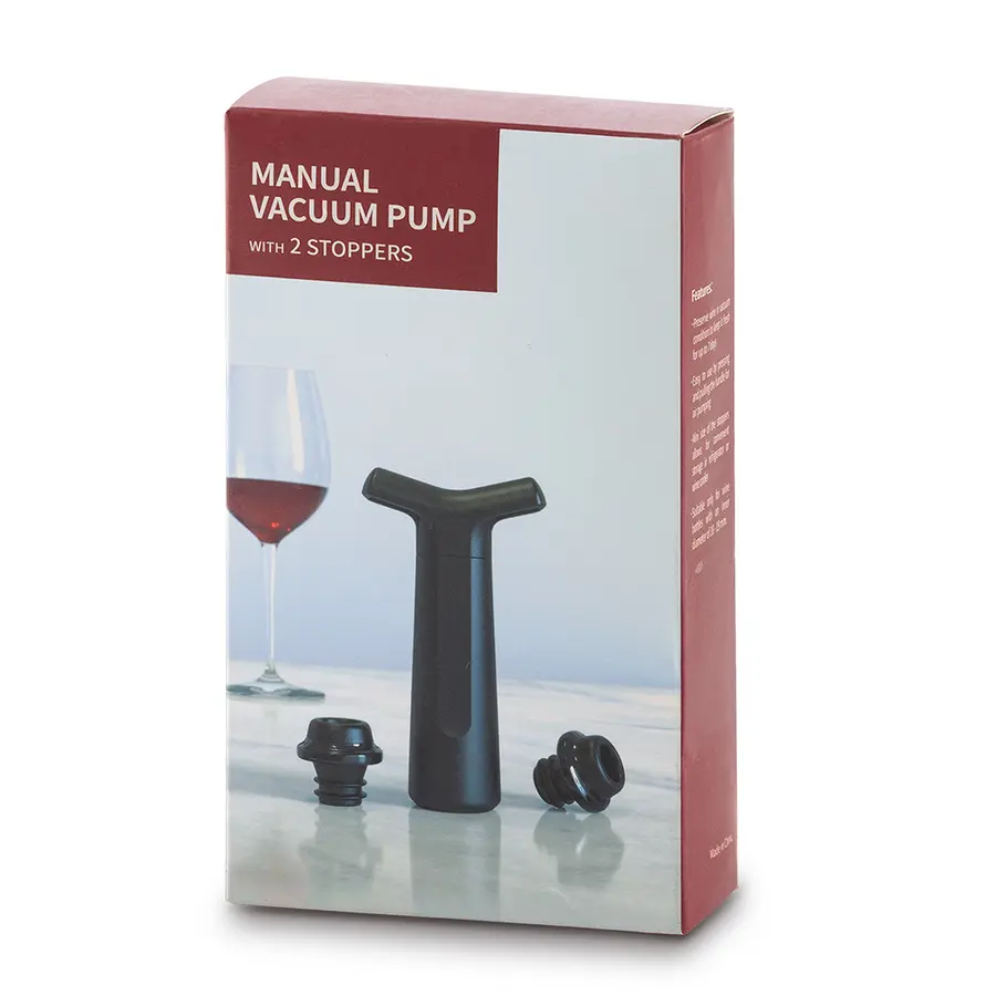Bomba manual de vacío con 4 tapones, apto para botellas con diámetro interno de boquilla entre 18-19mm. Empaque Caja Individual.