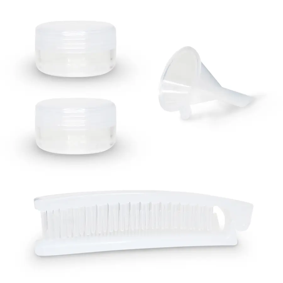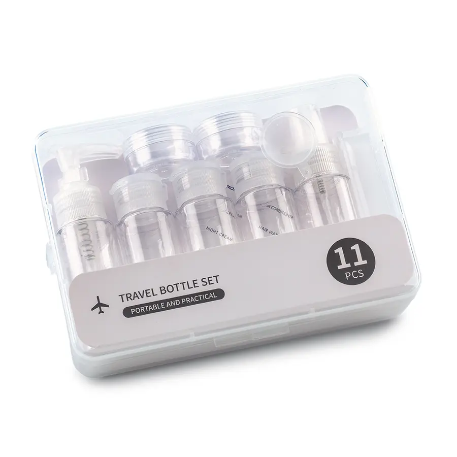 Set de 11 piezas plásticas para viaje: 3 frascos con tapa abatible (500 ml), 1 frasco dosificador (50 ml), 1 frasco tapa spray (50 ml), 2 tarros de crema (10 ml), 1 peine, 1 embudo, 1 espátula, identificadores adhesivos.