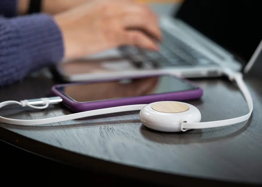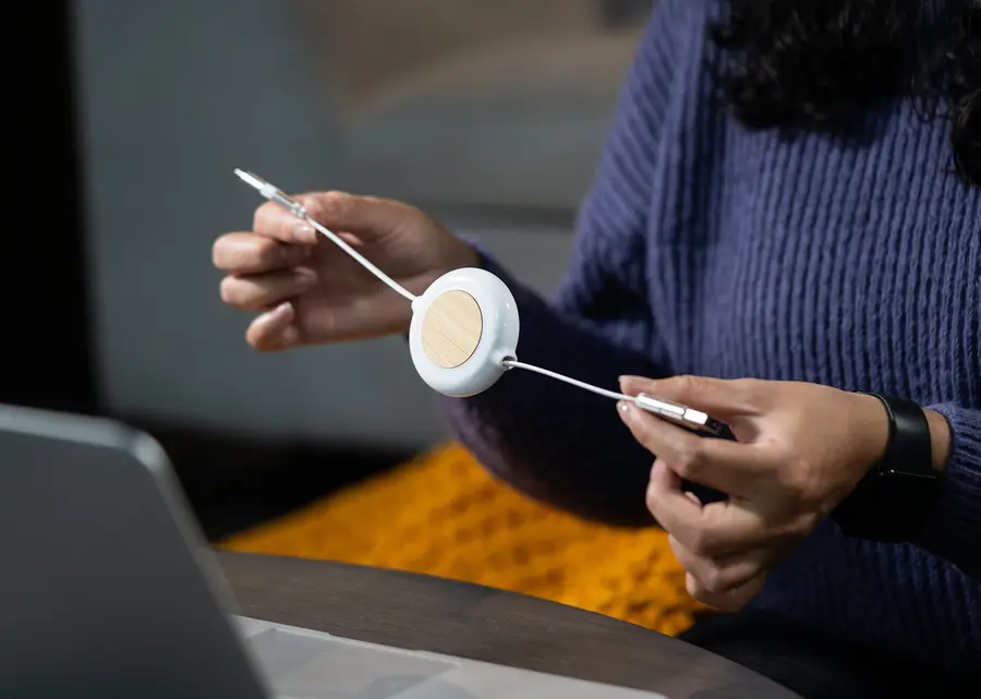 Cable retráctil estilo yoyo de carga rápida 60 W, ideal para cargar dispositivos móviles con eficiencia. Incluye conectores USB, Lightning y Tipo C en cada extremo para máxima compatibilidad. Diseño compacto con detalle central en bambú.