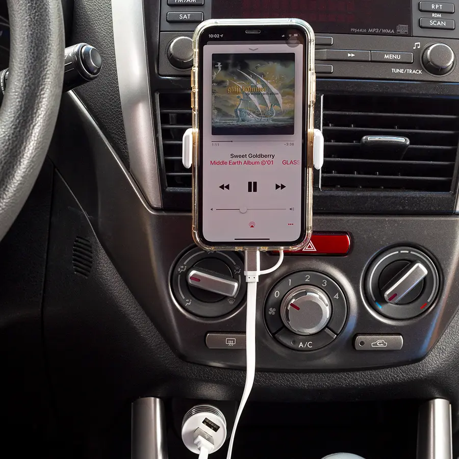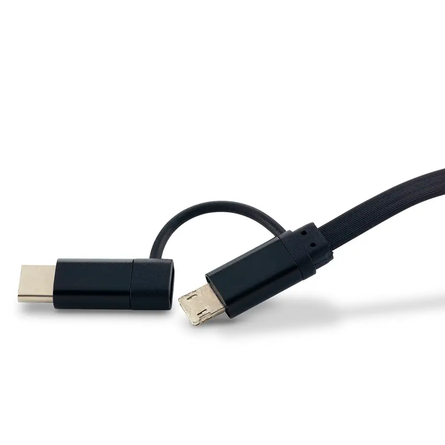 Set para carro con adaptador de corriente de un puerto, cable micro USB 2-1 y Tipo C y soporte ajustable para móviles. Empaque caja individual.