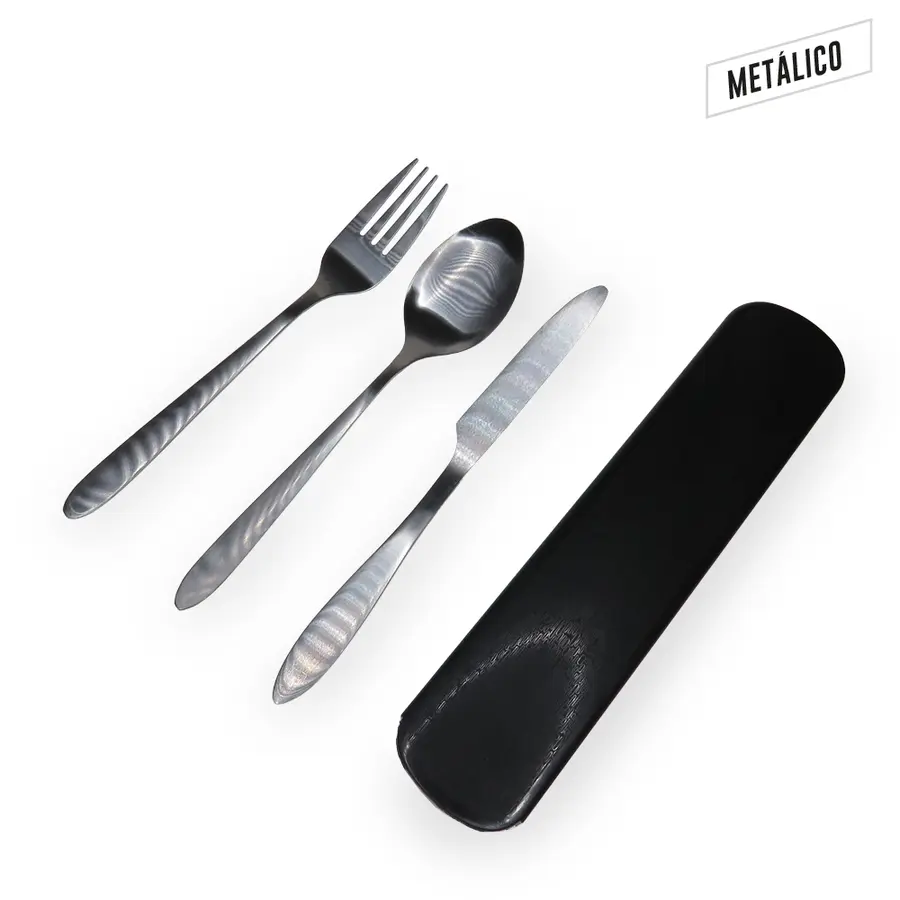 Juego de cubiertos en acero inoxidable (Cuchara, Cuchillo, Tenedor). Estuche en Plástico. Empaque caja individual. Medidas: 20 cm x 4 cm. Marca: 6 cm x 1,5 cm / Tampografía