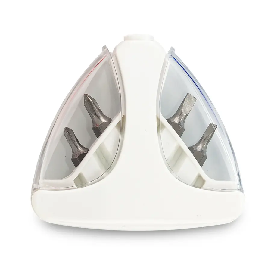 Mini set de destornilladores en estuche plástico que funciona como mango de agarre. De 4 piezas.