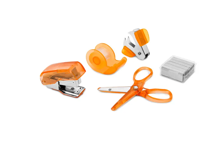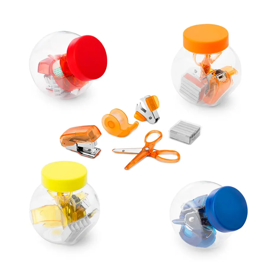 Set de escritorio, contiene: tijeras, cosedora, quita ganchos corta cinta y repuesto de ganchos.