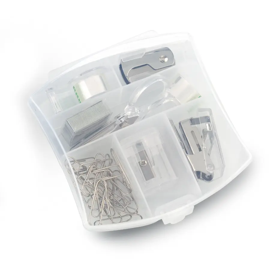 Set de escritorio plástico con cinta, repuesto de cinta, ganchos, tijeras, quita ganchos, clips, tajalápiz y cosedora.
