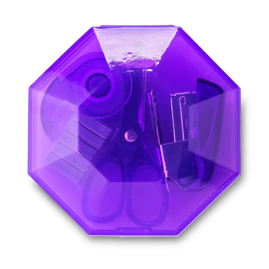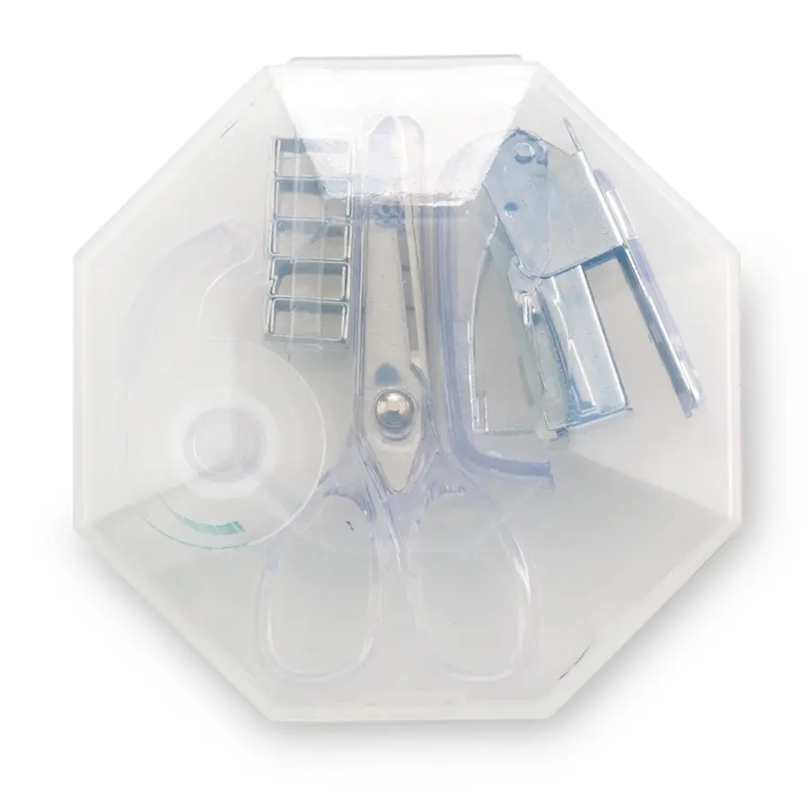Set de escritorio plástico con dispensador de cinta, tijeras, cosedora y ganchos.