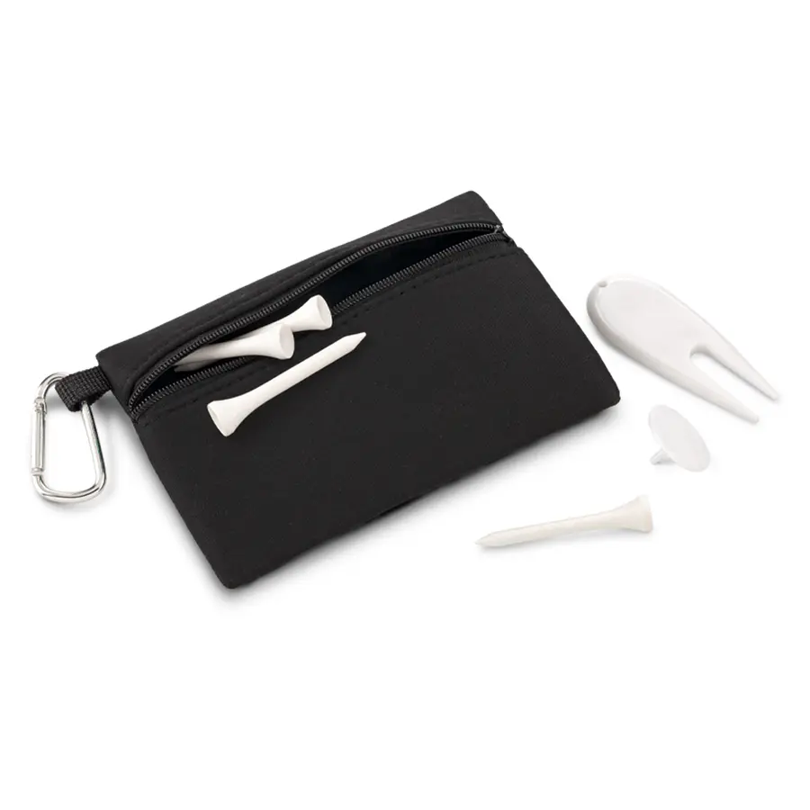 Set de golf en poliéster con carabinero. Incluye: 4 tees, 1 marcador y 1 arregla piques en plástico.