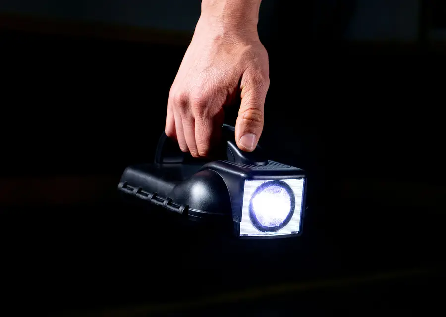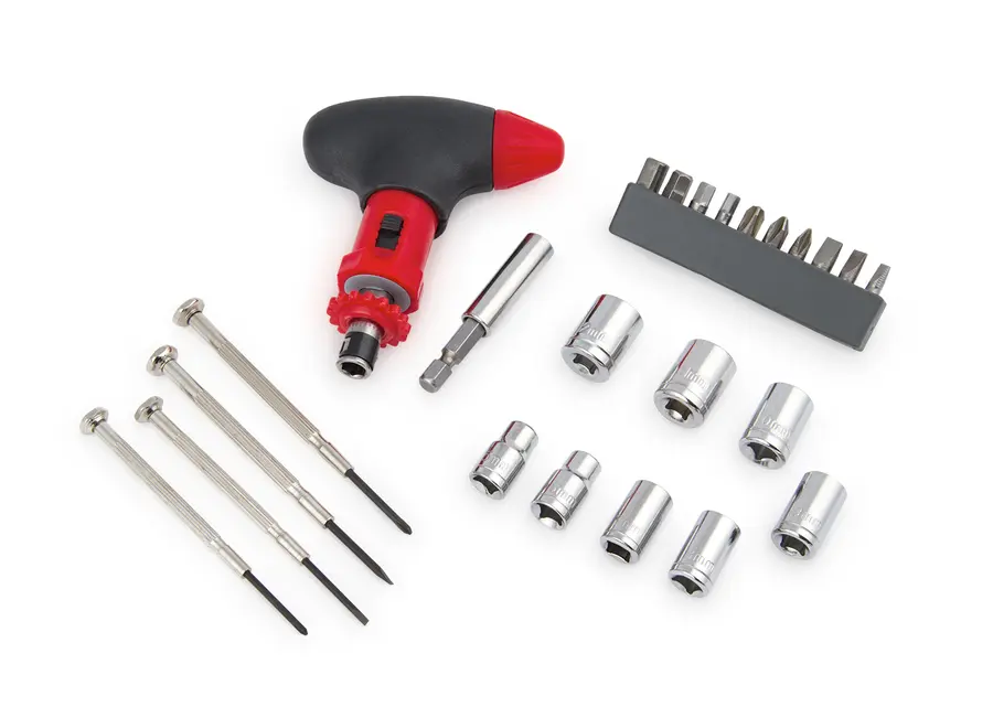 Caja de herramientas con linterna externa (4 pilas AA no incluidas). Incluye ratchet, 8 copas estándar, 10 puntas de destornillador, 4 destornilladores de precisión, un portapuntas magnético.