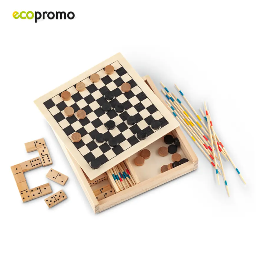 Set de juegos en madera. Incluye ajedrez, dominó, y palillos.
