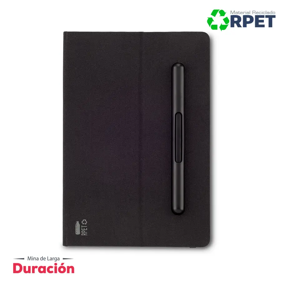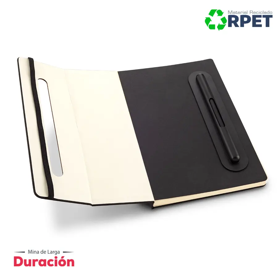 Libreta de 80 hojas, con cubiertas en poliéster reciclado RPET. Con soporte para telefono. Bolígrafo y lápiz tipo Iinfinity, con una mina que no se acaba fácilmente, no necesita usar tajalápiz. Con cierre elástico. Empaque caja individual.