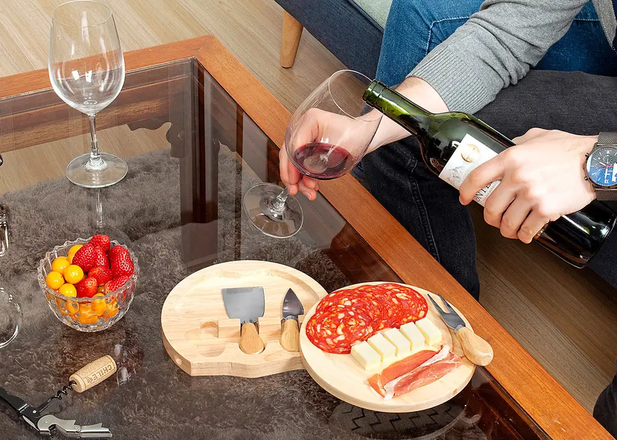Tabla de quesos redonda con 3 cuchillos: Cuchillo para parmesano, quesos duros y Tenedor. Lavar con agua y jabón y secar al aire libre.