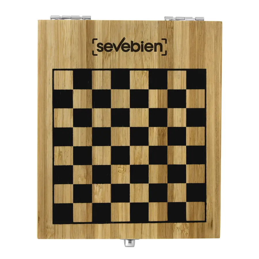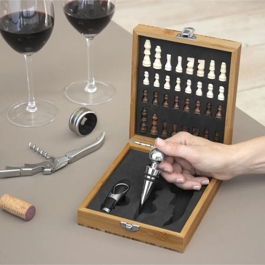 17 x 14 x 4,5 cm. Bambú, madera y acero inoxidable. Set de vino de 4 piezas (sacacorchos, anillo antigoteo, tapón y vertedor) con juego de ajedrez. Caja contenedora en bambú con piezas de ajedrez en madera. Abridor de acero inoxidable 420. Anillo de acero inoxidable 210. Tapón con aleación de zinc y aluminio. Vertedor de acero inoxidable 201 + silicona. Presentación en caja de regalo kraft.