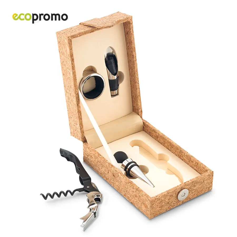 Set de vino en estuche de corcho con dosificador, corcho, descorchador y argolla antigoteo. Empaque Caja Individual.