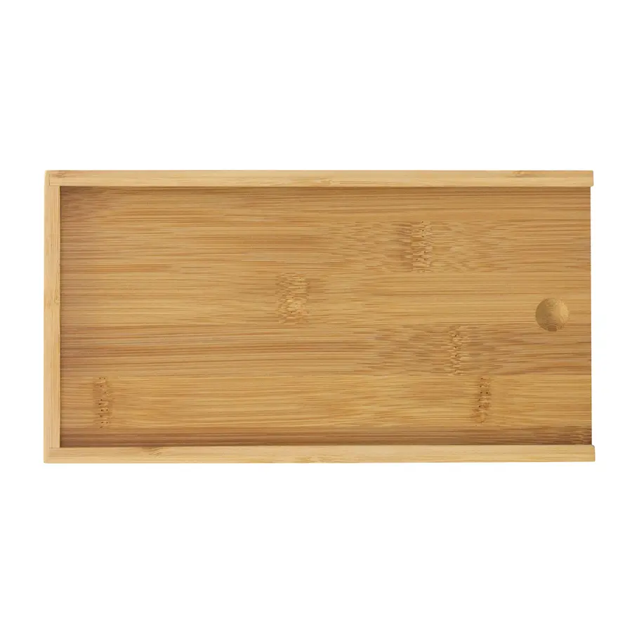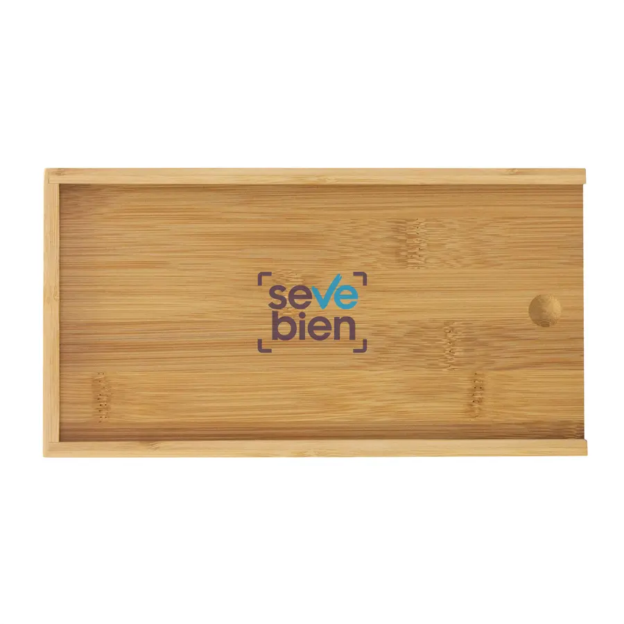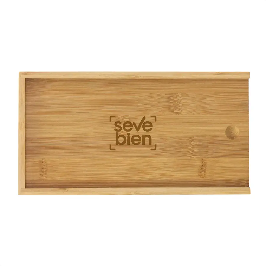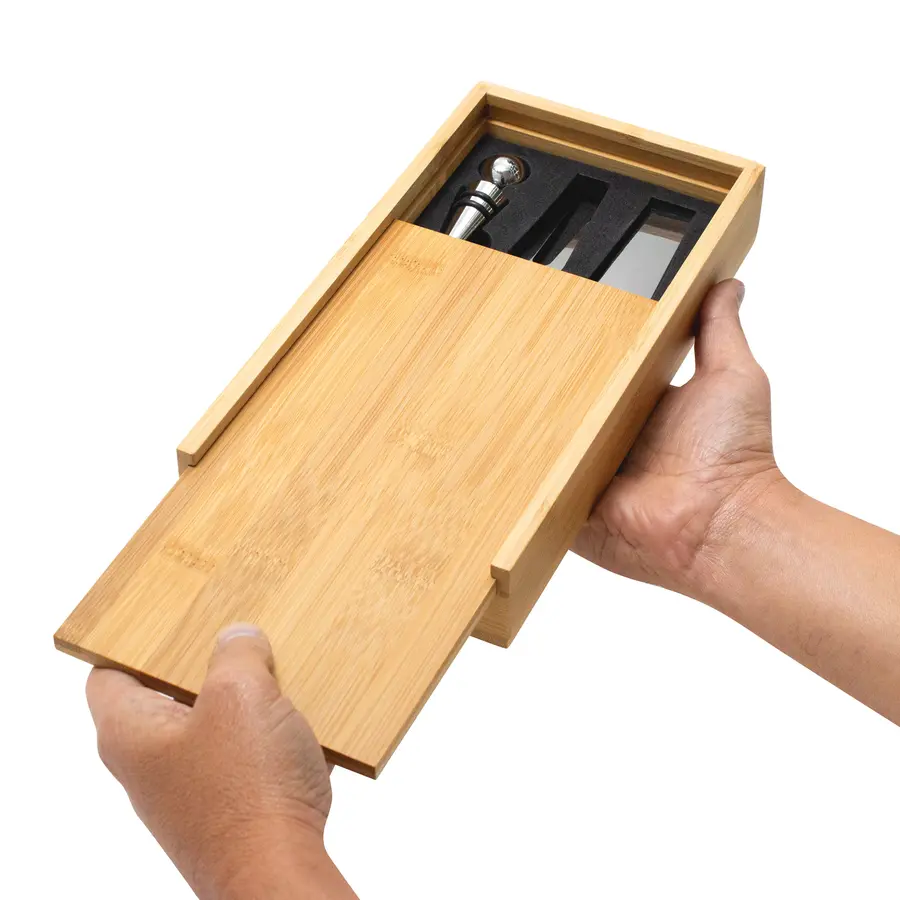 24.5 x 13 x 3.3 cm. (caja). Bambú y acero inoxidable. Set de accesorios para vino y corte de quesos. Caja con tapa deslizable de bambú. Tapa / tabla de corte de 24 x 12 x 0,8 cm. Contiene 5 piezas: Destapador sacacorchos (acero inoxidable 420, 11 cm. y 50 g.); Cuchillo y tenedor de queso (acero inoxidable 420 con mango de madera de caucho, 12,8 cm. y 25 g. c/u) Anillo de vino (acero inoxidable 430 y non woven, Ø 3,9 cm.) ; y Tapón de vino (aleación de zinc, 56 g.). Presentación en caja de regalo kraft.