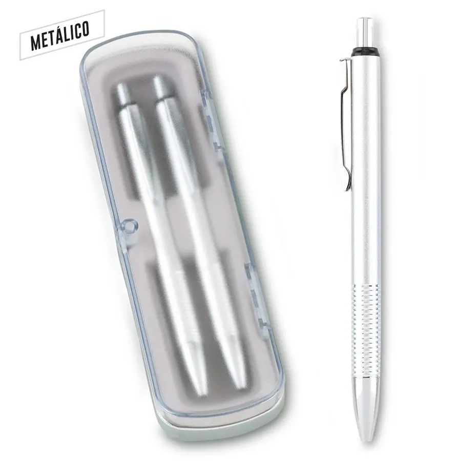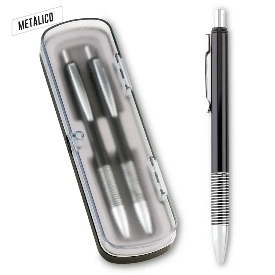 Set de bolígrafo y portaminas metálicos en estuche plástico. Mina 0.5 mm. Empaque Caja Individual.
