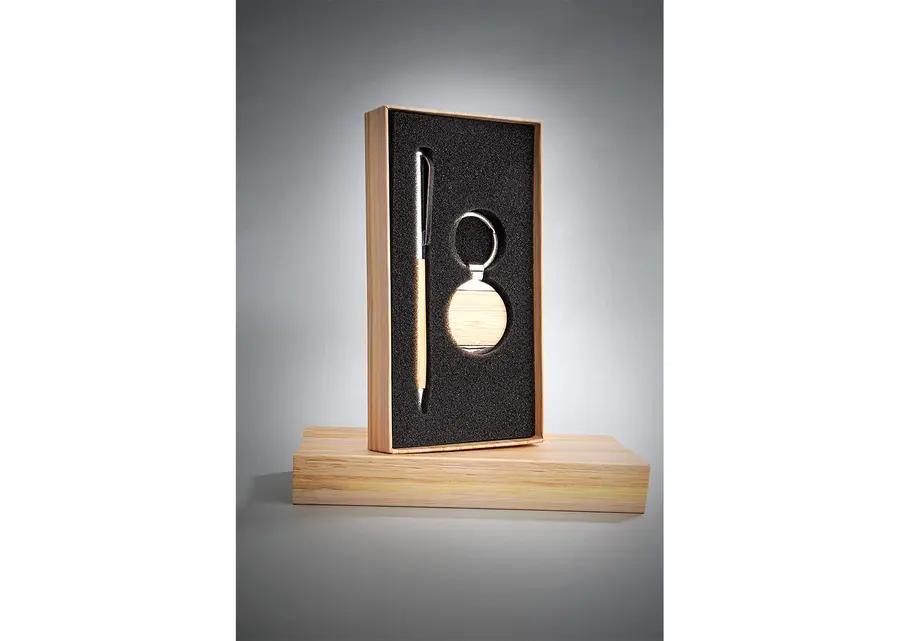 Set ejecutivo, incluye llavero circular metálico y bolígrafo en Aluminio con sistema twist ambos con acabados en bambú para la marca en láser. Empaque caja con papel forrado imitación bambú.