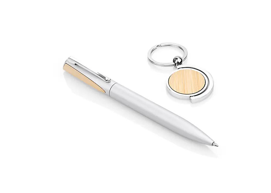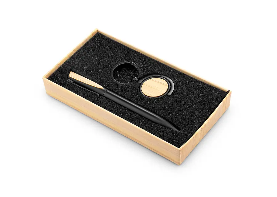 Set ejecutivo, incluye llavero circular metálico y bolígrafo en Aluminio con sistema twist y clip metálico acabado en Bamboo, ambos con acabados en bambú para la marca en laser. Empaque caja individual con papel forrado imitación bamboo.