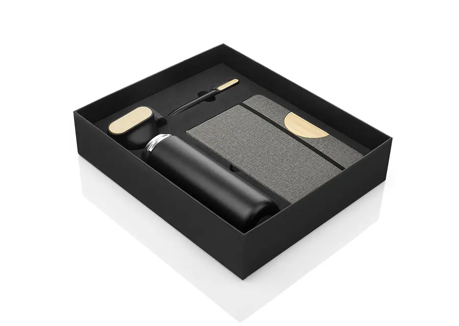 Set ejecutivo con estuche de lujo. Incluye bolígrafo en aluminio con sistema twist, Libreta con 80 hojas rayadas, banda elastica de cierre lateral, cinta marcadora y portabolígrafo. Mug de 600 ml con tapa de Bambú / 20 Oz en acero inoxidable con tapa rosca y banda de silicona para transportar con facilidad. los 3 elementos tienen un detalle en Bambú para marcar en láser.