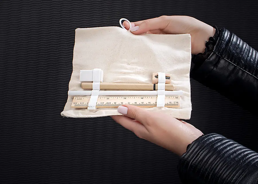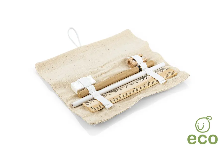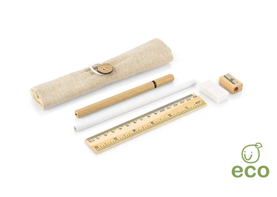 MATERIAL: Estuche en algodón; lápiz, regla y sacapuntas en madera, y bolígrafo en papel reciclado