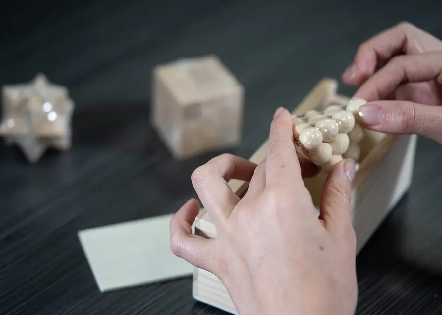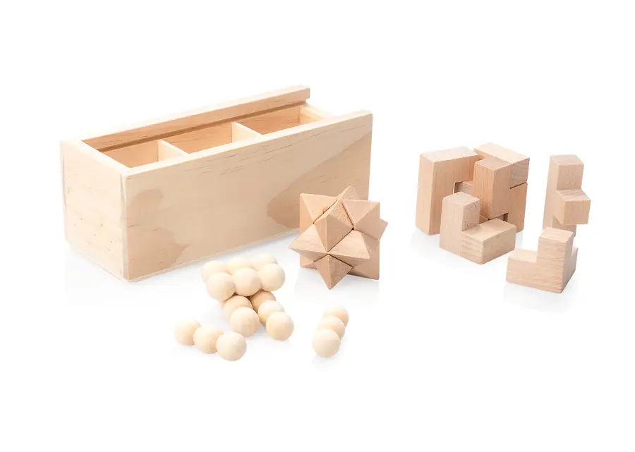 Set de madera lisa y agradable al tacto con 3 juegos de lógica. Incluye rompecabezas 3D para desafiar tu ingenio. Viene en una práctica caja de almacenamiento con tapa deslizante.