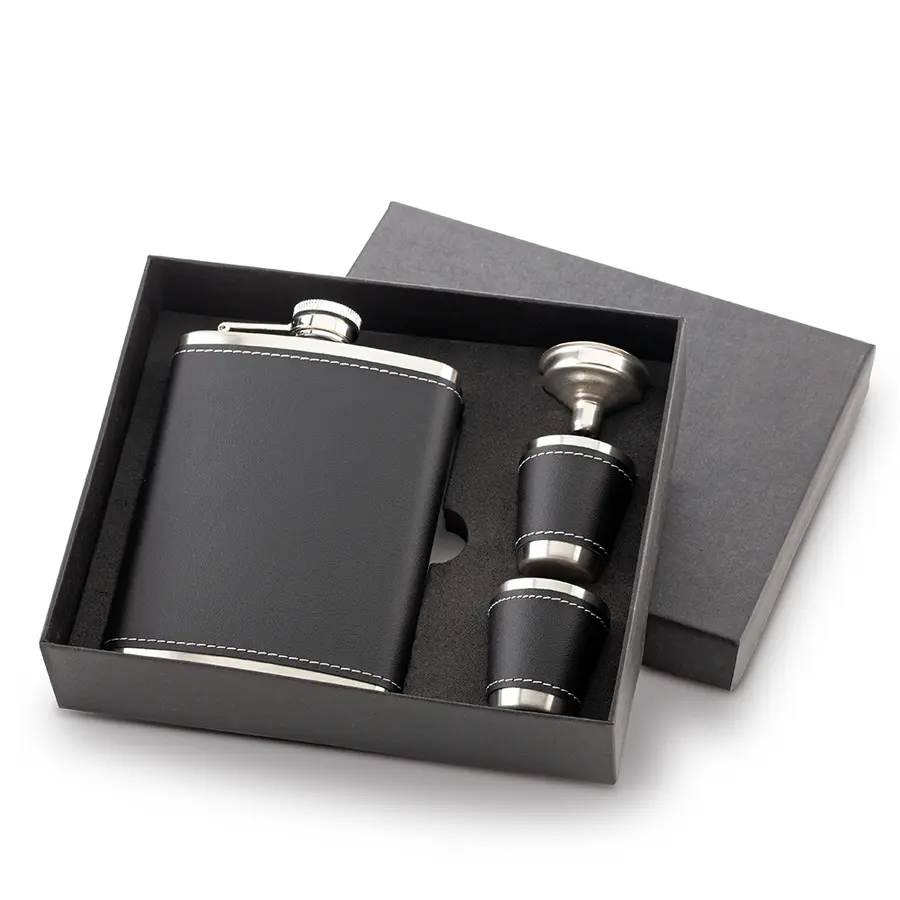 Juego de licorera de 200ml de capacidad en acero inoxidable, dos copas y mini embudo. Empaque Caja Individual.