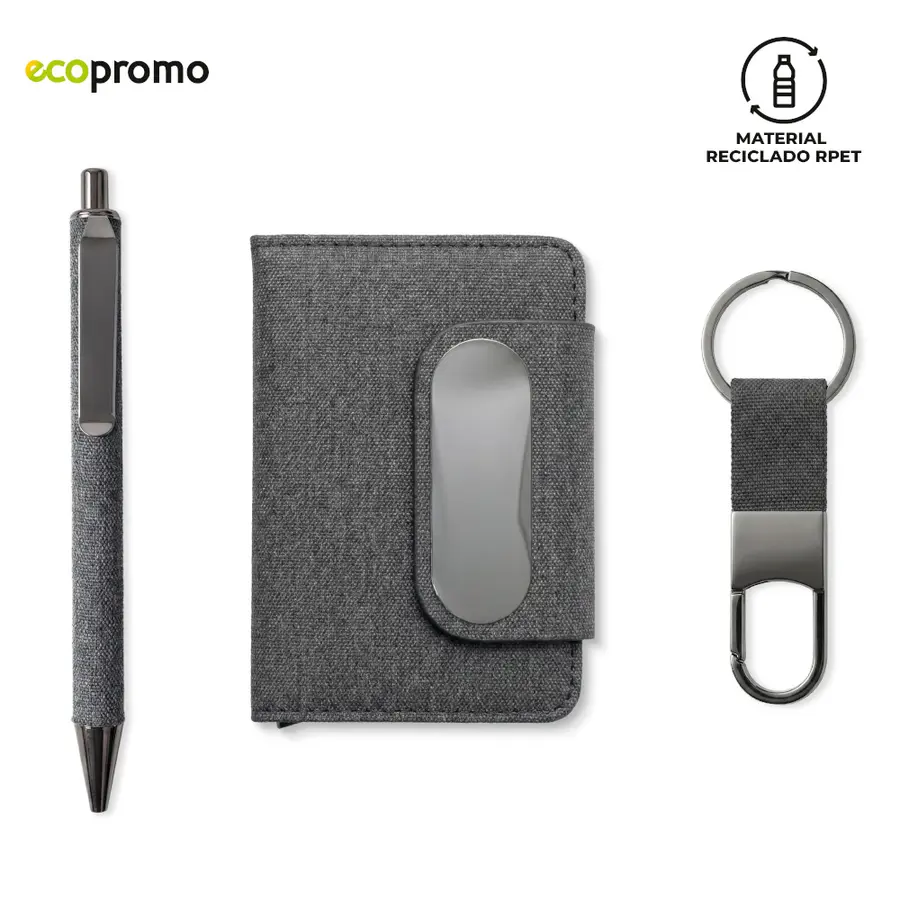 Set de bolígrafo metálico recubierto en tela reciclada RPET, tarjetero metálico recubierto en tela reciclada RPET y llavero reciclado RPET. Empaque caja individual.